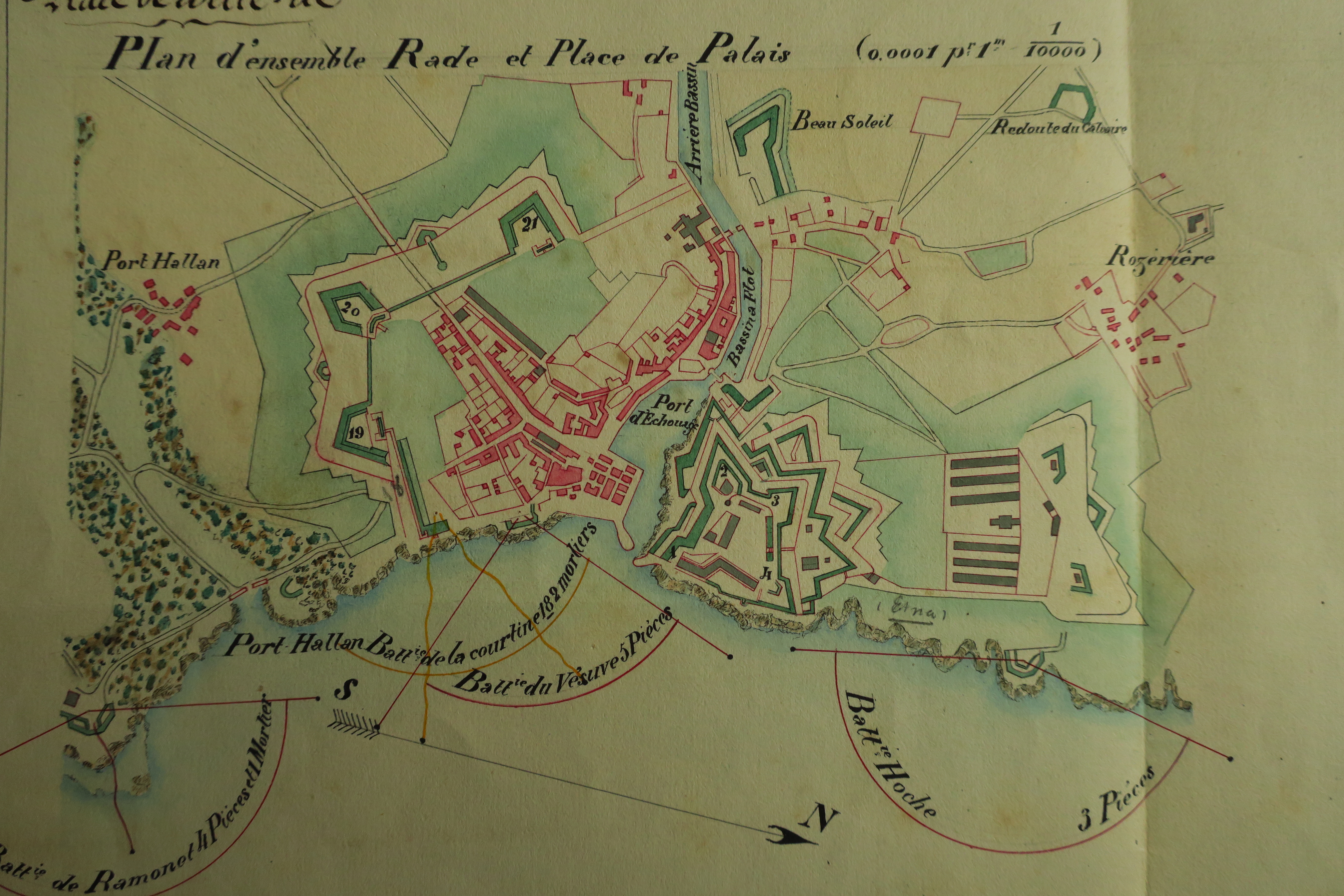Service historique de la Défense, département Armée de Terre, Vincennes. Archives du Génie ; Article 8, Places françaises et d'Algérie : 1 VH 297, Place de Belle-Île-en-Mer, projets et dépenses annuels, 1862-1875. Direction du Génie de Brest, Place de Belle-Ile, feuille n° 1 des projets pour 1864-1865, organiser une batterie de 2 mortiers à gauche de la courtine 18, 30 janvier 1864.