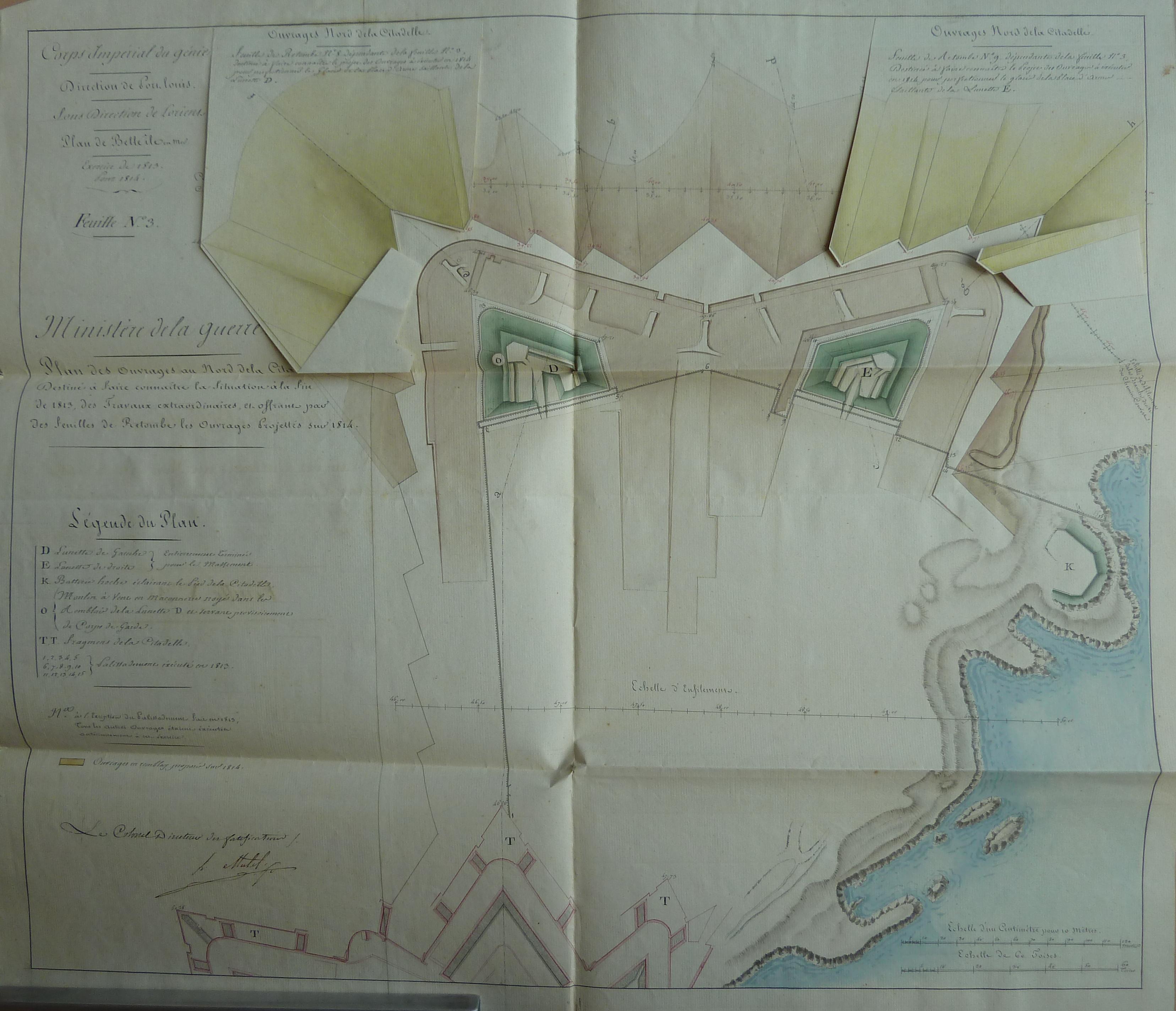 Service historique de la Défense, département Armée de Terre, Vincennes. Archives du Génie ; Article 8, Places françaises et d'Algérie : 1 VH 286, Place de Belle-Île-en-Mer, projets et dépenses annuels, 1807-1816. Direction du Génie de Port-Louis, Place de Belle-Ile, feuille n° 3 des projets pour 1814, plan des ouvrages au nord de la citadelle, 1813.