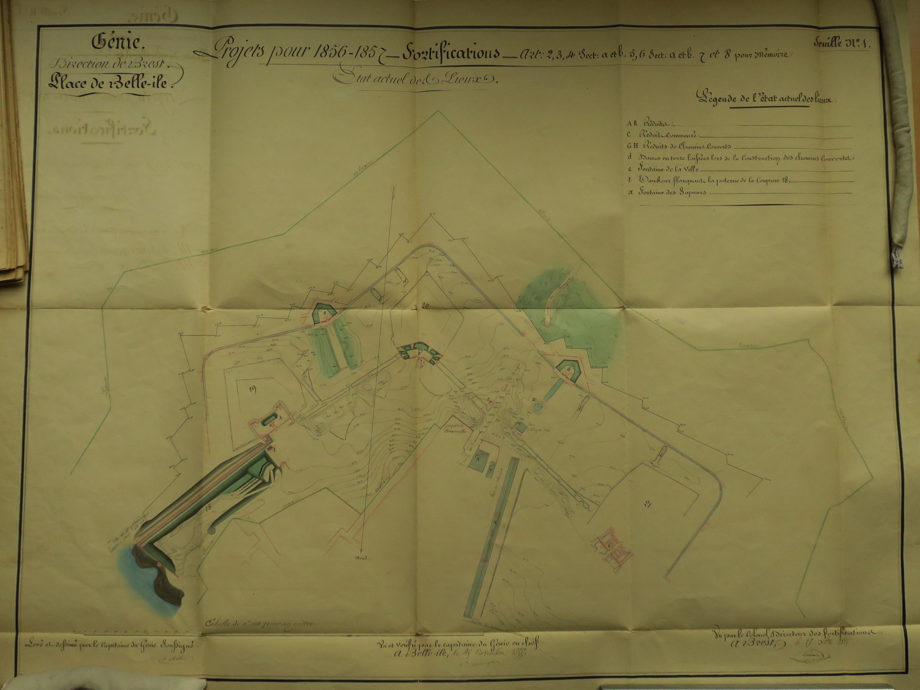 Service historique de la Défense, département Armée de Terre, Vincennes. Archives du Génie ; Article 8, Places françaises et d'Algérie : 1 VH 294, Place de Belle-Île-en-Mer, projets et dépenses annuels, 1854-1857. Direction du Génie de Brest, Place de Belle-Ile, feuille n° 1 des projets pour 1856-1857, état actuel des lieux, 25 novembre 1855.