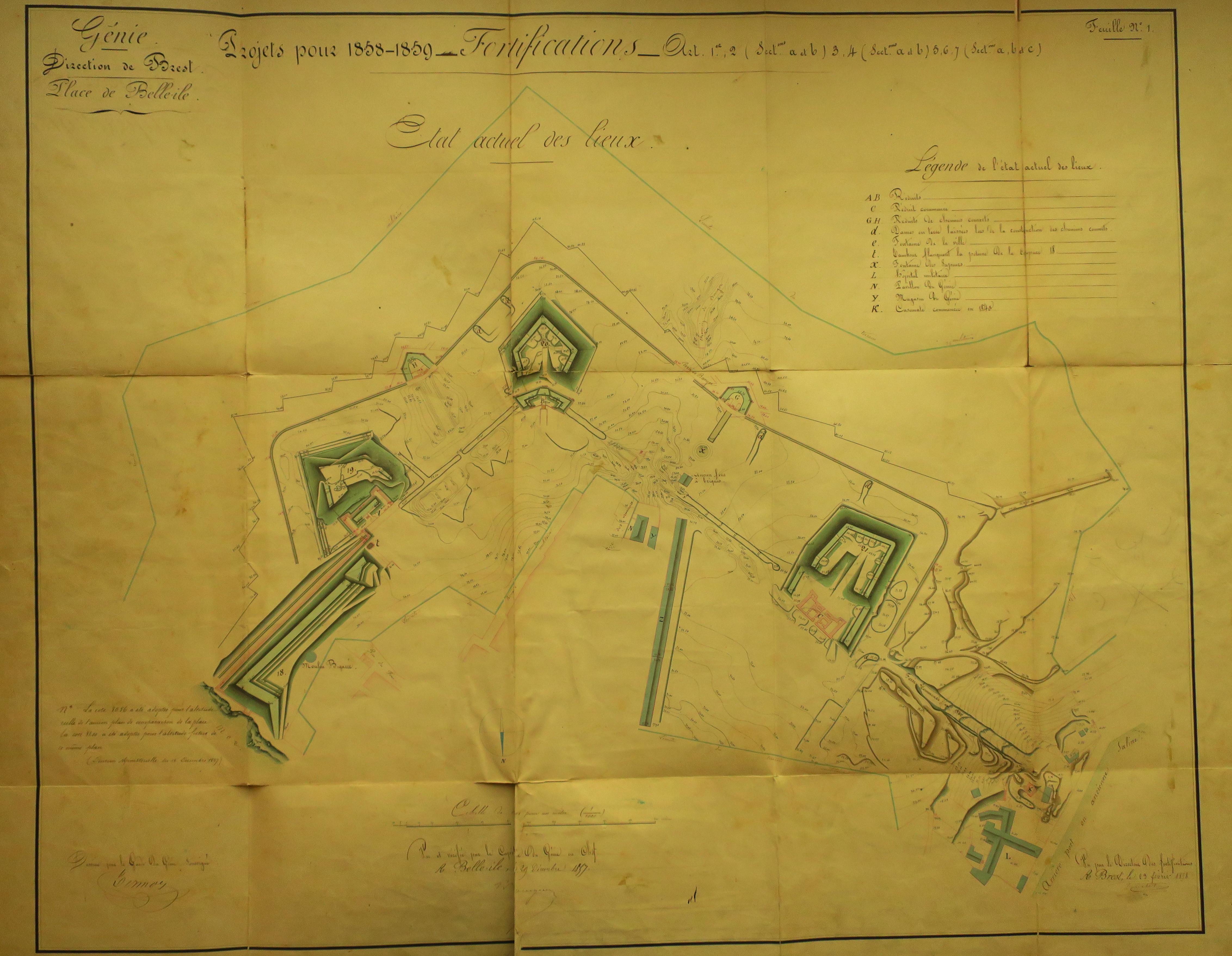 Service historique de la Défense, département Armée de Terre, Vincennes. Archives du Génie ; Article 8, Places françaises et d'Algérie : 1 VH 295, Place de Belle-Île-en-Mer, projets et dépenses annuels, 1858-1859. Direction du Génie de Brest, Place de Belle-Ile, feuille n° 1 des projets pour 1856-1857, état actuel des lieux, 29 décembre 1857.