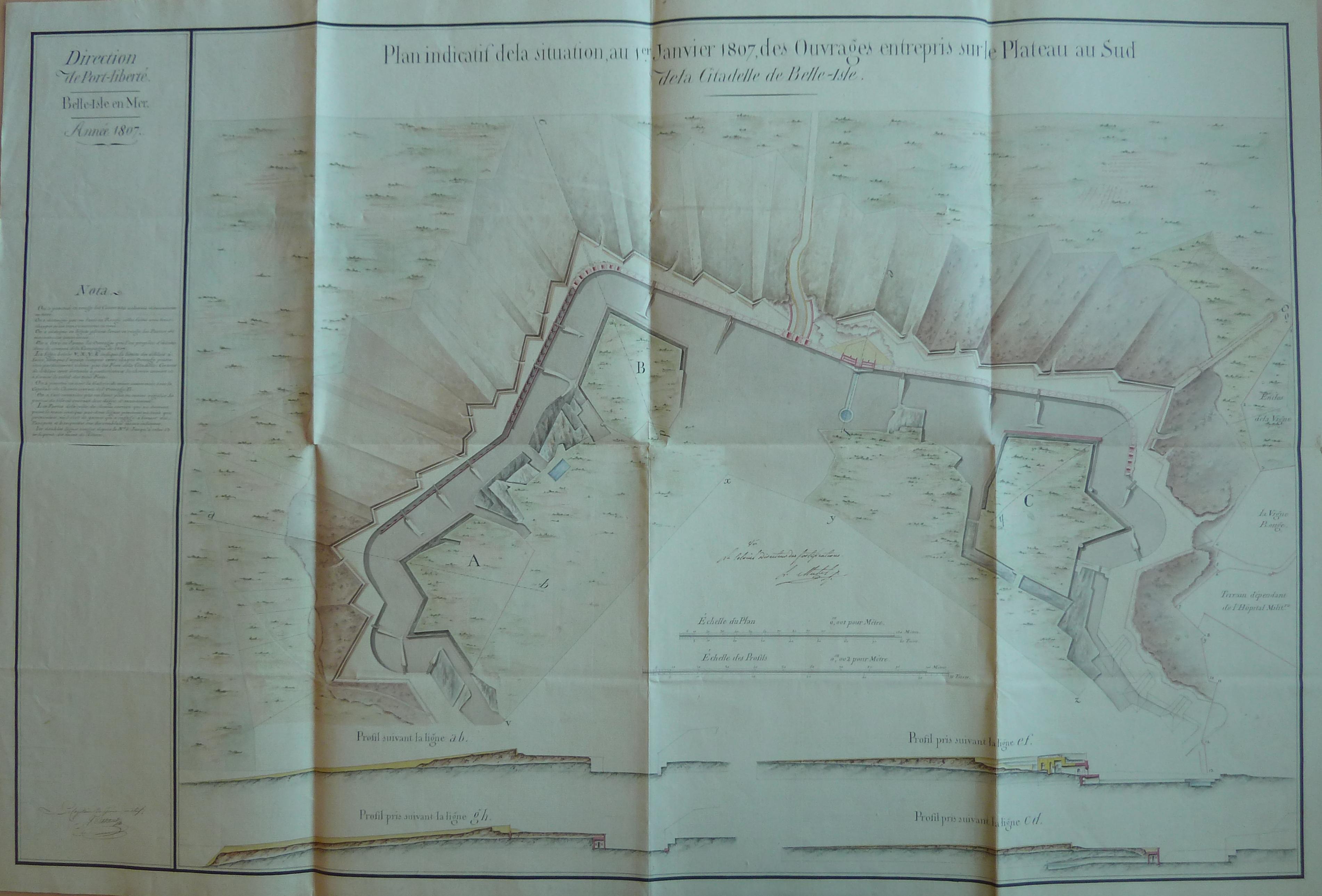 Service historique de la Défense, département Armée de Terre, Vincennes. Archives du Génie ; Article 8, Places françaises et d'Algérie : 1 VH 286, Place de Belle-Île-en-Mer, projets et dépenses annuels, 1807-1816. Direction du Génie de Port-Liberté, plan indicatif de la situation au 1er janvier 1807 des ouvrages entrepris sur le plateau au sud de la citadelle de Belle-Isle.