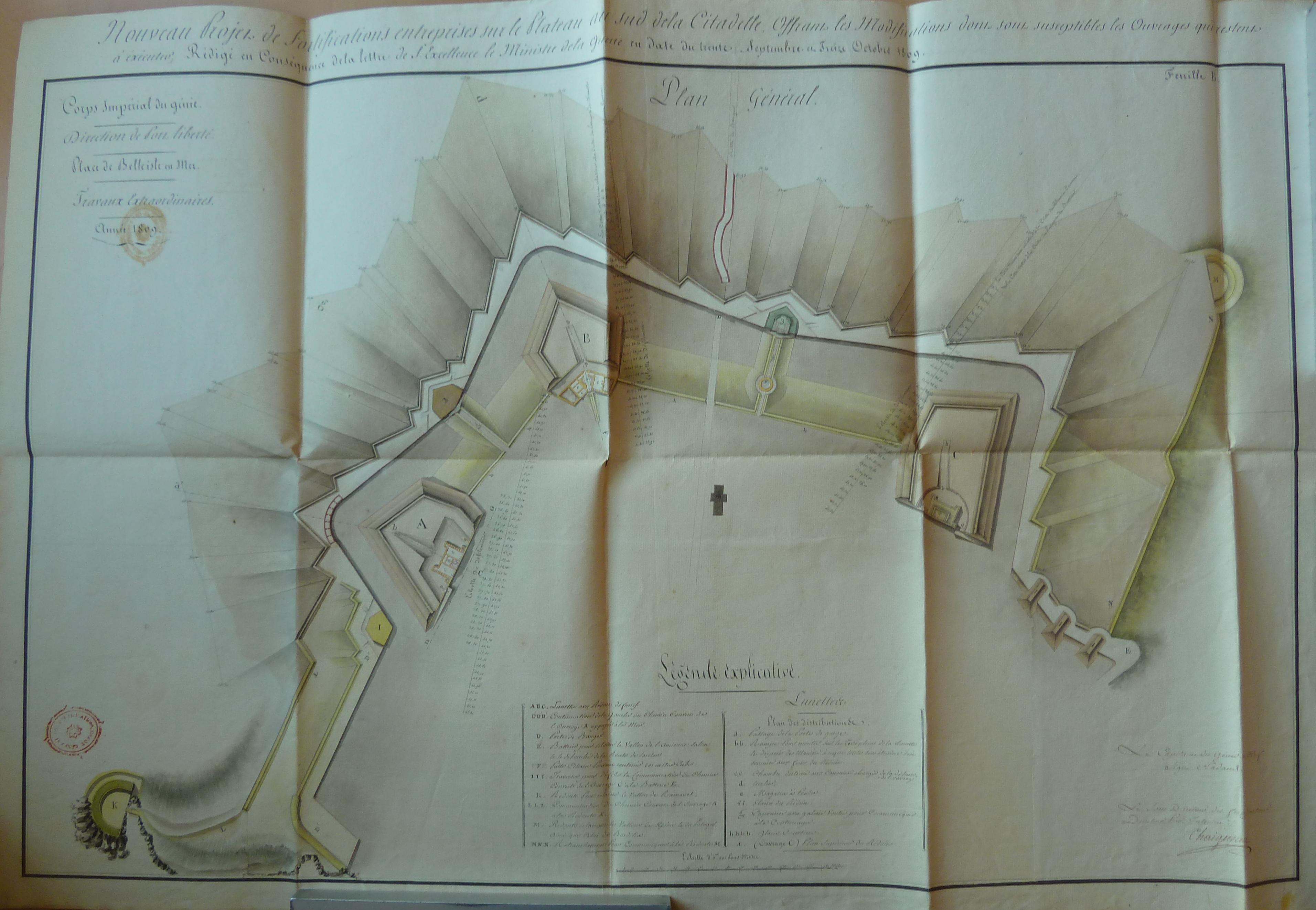 Service historique de la Défense, département Armée de Terre, Vincennes. Archives du Génie ; Article 8, Places françaises et d'Algérie : 1 VH 286, Place de Belle-Île-en-Mer, projets et dépenses annuels, 1807-1816. Direction du Génie de Port-Liberté, Place de Belle-isle-en-Mer, nouveau projet de fortifications entreprises sur le plateau au sud de la citadelle, 1809.