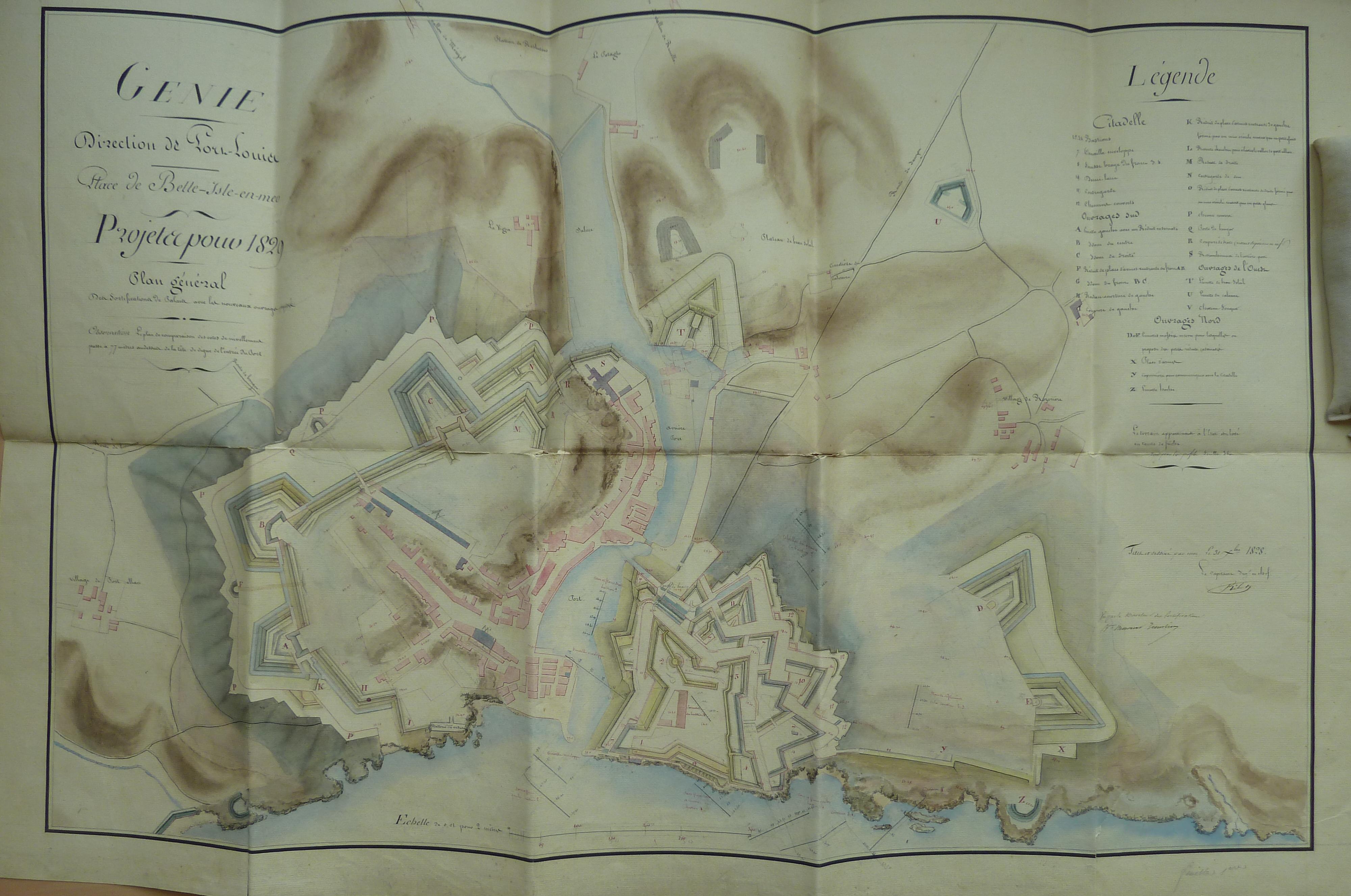 Service historique de la Défense, département Armée de Terre, Vincennes. Archives du Génie ; Article 8, Places françaises et d'Algérie : 1 VH 288, Place de Belle-Île-en-Mer, projets et dépenses annuels, 1826-1830. Direction du Génie de Port-Louis, Place de Belle-isle-en-Mer, feuille n° 1 des projets pour 1829, plan général, 31 décembre 1828.