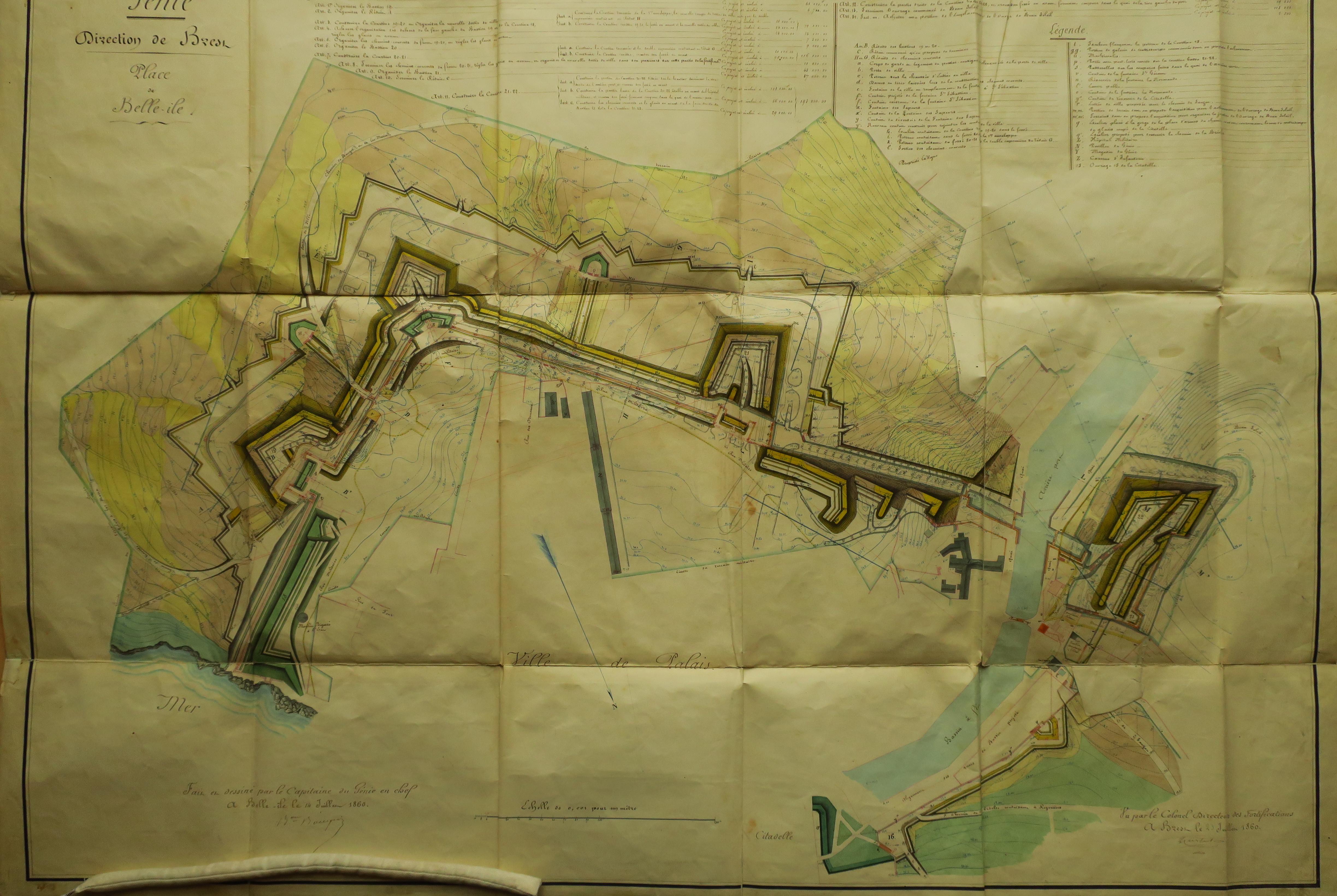 Service historique de la Défense, département Armée de Terre, Vincennes. Archives du Génie ; Article 8, Places françaises et d'Algérie : 1 VH 296, Place de Belle-Île-en-Mer, projets et dépenses annuels, 1860-1861. Direction du Génie de Brest, Place de Belle-Ile, feuille n° 8 des projets pour 1860-1861, 14 juillet 1860.