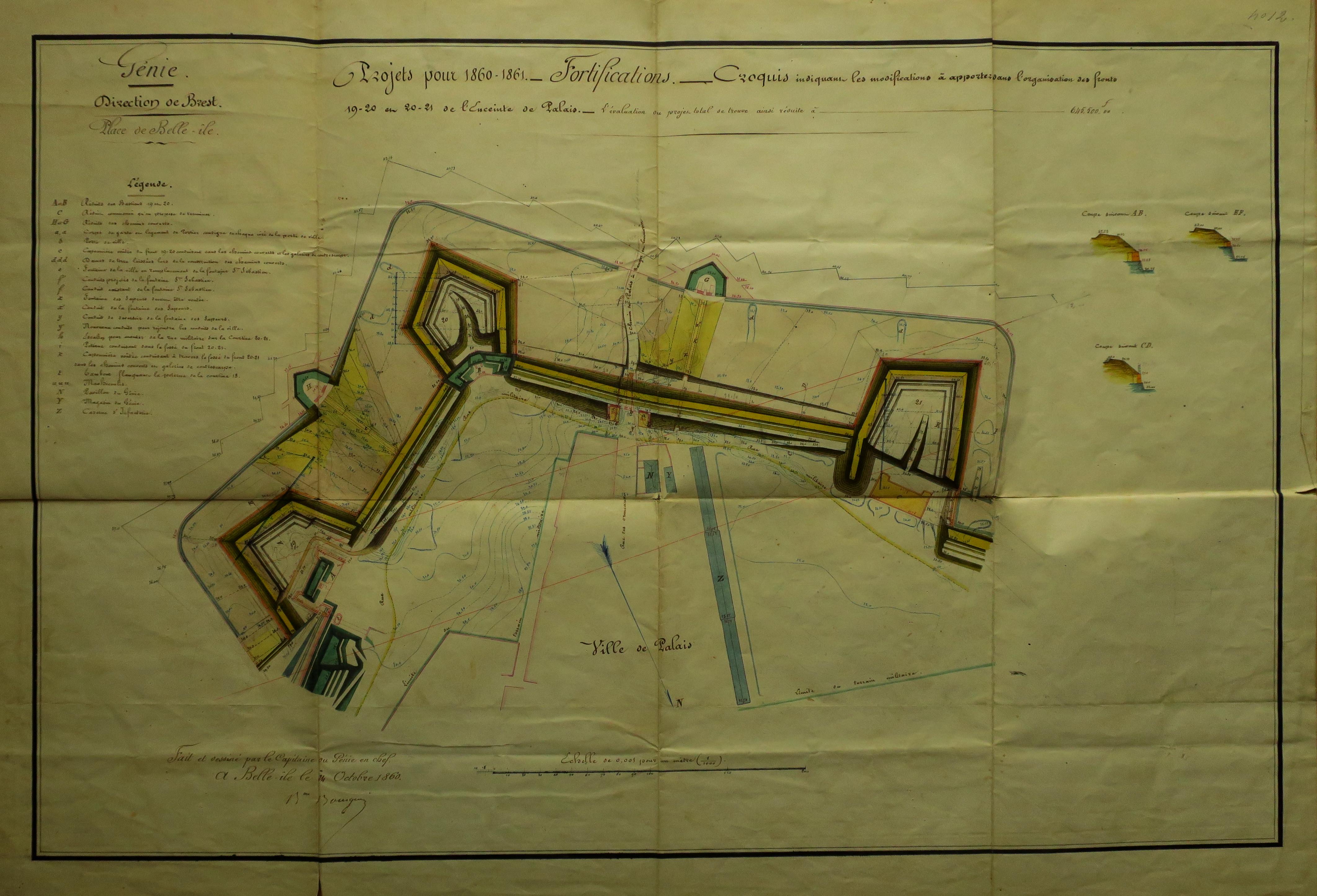 Service historique de la Défense, département Armée de Terre, Vincennes. Archives du Génie ; Article 8, Places françaises et d'Algérie : 1 VH 296, Place de Belle-Île-en-Mer, projets et dépenses annuels, 1860-1861. Direction du Génie de Brest, Place de Belle-Ile, feuille n° 12 des projets pour 1860-1861, 24 octobre 1860.
