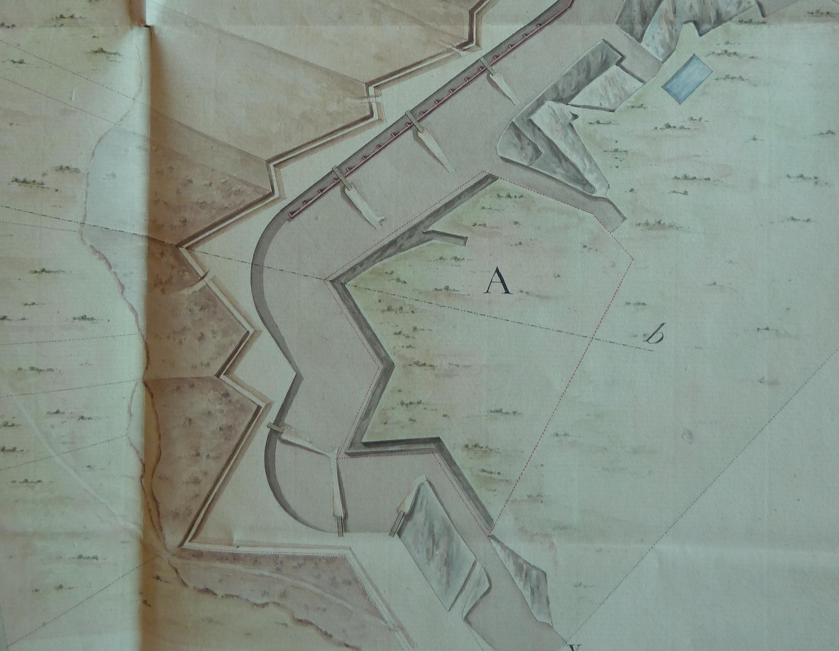 Service historique de la Défense, département Armée de Terre, Vincennes. Archives du Génie ; Article 8, Places françaises et d'Algérie : 1 VH 286, Place de Belle-Île-en-Mer, projets et dépenses annuels, 1807-1816. Direction du Génie de Port-Liberté, plan indicatif de la situation au 1er janvier 1807 des ouvrages entrepris sur le plateau au sud de la citadelle de Belle-Isle.