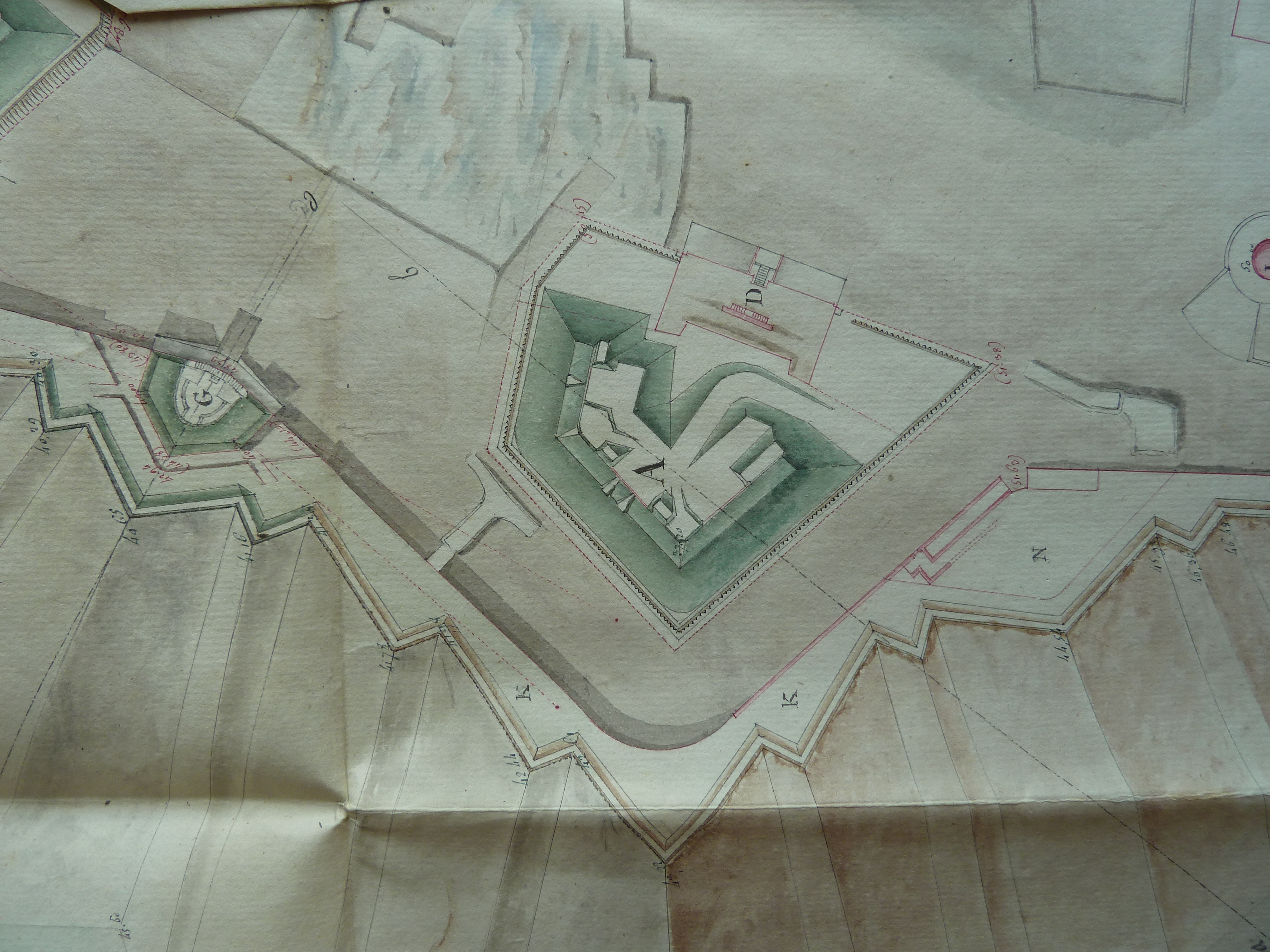 Service historique de la Défense, département Armée de Terre, Vincennes. Archives du Génie ; Article 8, Places françaises et d'Algérie : 1 VH 286, Place de Belle-Île-en-Mer, projets et dépenses annuels, 1807-1816. Direction du Génie de Port-Louis, Place de Belle-Ile-en-Mer, plan des ouvrages au sud de la citadelle destiné à faire connaître la situation, à la fin de 1813, des travaux extraordinaires.
