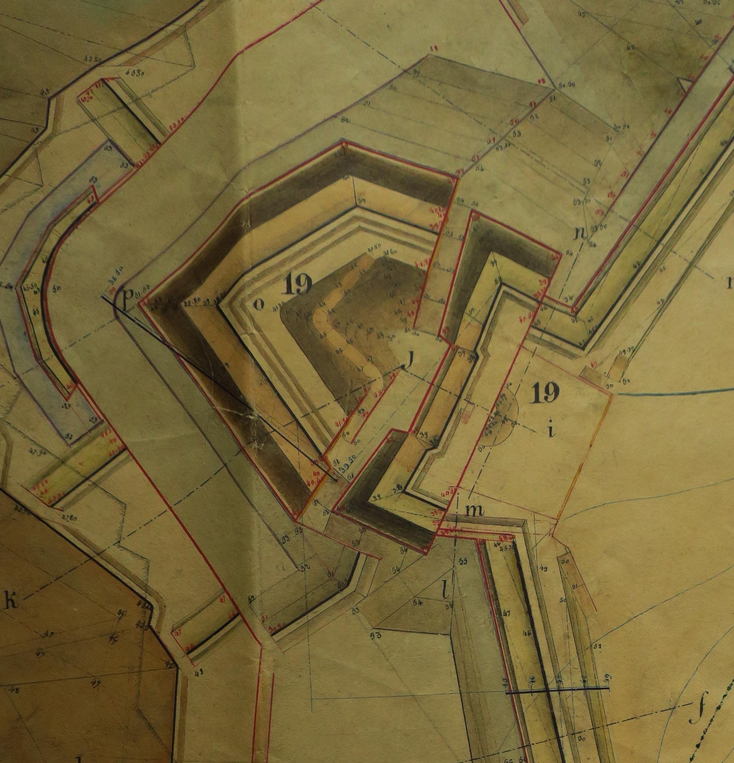 Service historique de la Défense, département Armée de Terre, Vincennes. Archives du Génie ; Article 8, Places françaises et d'Algérie : 1 VH 290, Place de Belle-Île-en-Mer, projets et dépenses annuels, 1837-1842. Direction du Génie de Nantes, Place de Belle-Ile, feuille n° 2 des projets pour 1838, enceinte de la place de Palais, 11 mars 1838.