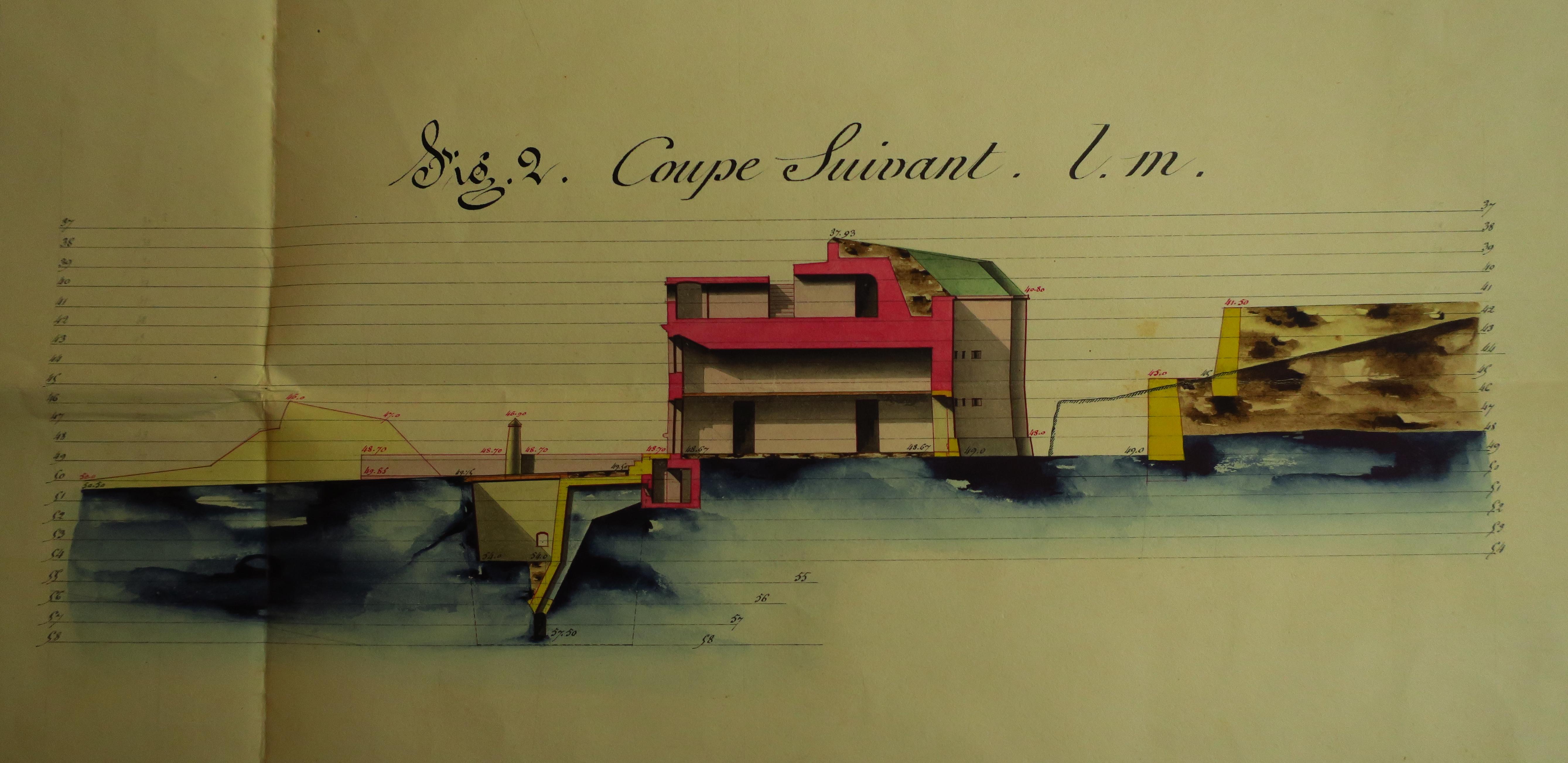 Service historique de la Défense, département Armée de Terre, Vincennes. Archives du Génie ; Article 8, Places françaises et d'Algérie : 1 VH 291, Place de Belle-Île-en-Mer, projets et dépenses annuels, 1843-1846. Direction du Génie de Nantes, Place de Belle-Ile, feuille n° 1 des projets pour 1844, coupure 18, bastion 19, galerie de contrescarpe, 16 février 1844.
