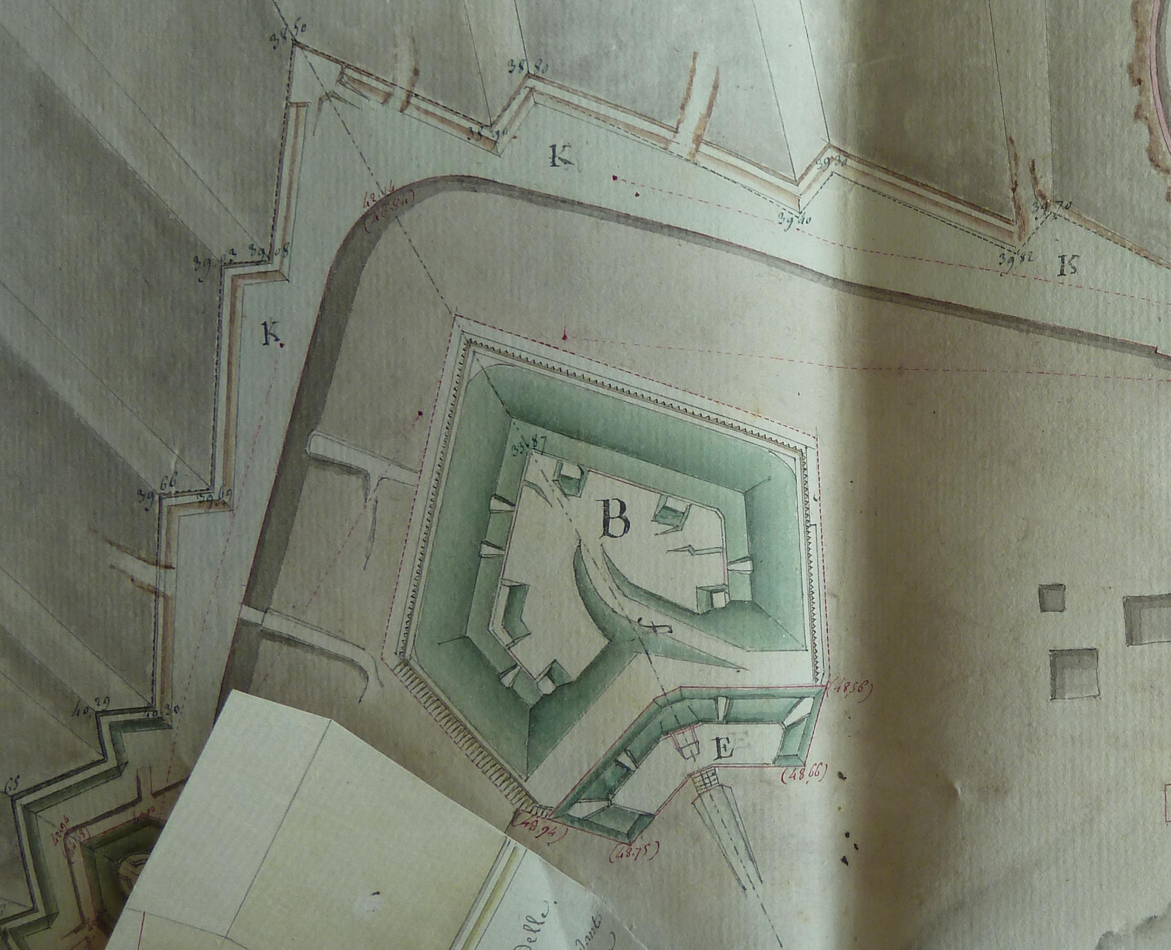 Service historique de la Défense, département Armée de Terre, Vincennes. Archives du Génie ; Article 8, Places françaises et d'Algérie : 1 VH 286, Place de Belle-Île-en-Mer, projets et dépenses annuels, 1807-1816. Direction du Génie de Port-Louis, Place de Belle-Ile-en-Mer, plan des ouvrages au sud de la citadelle destiné à faire connaître la situation, à la fin de 1813, des travaux extraordinaires.