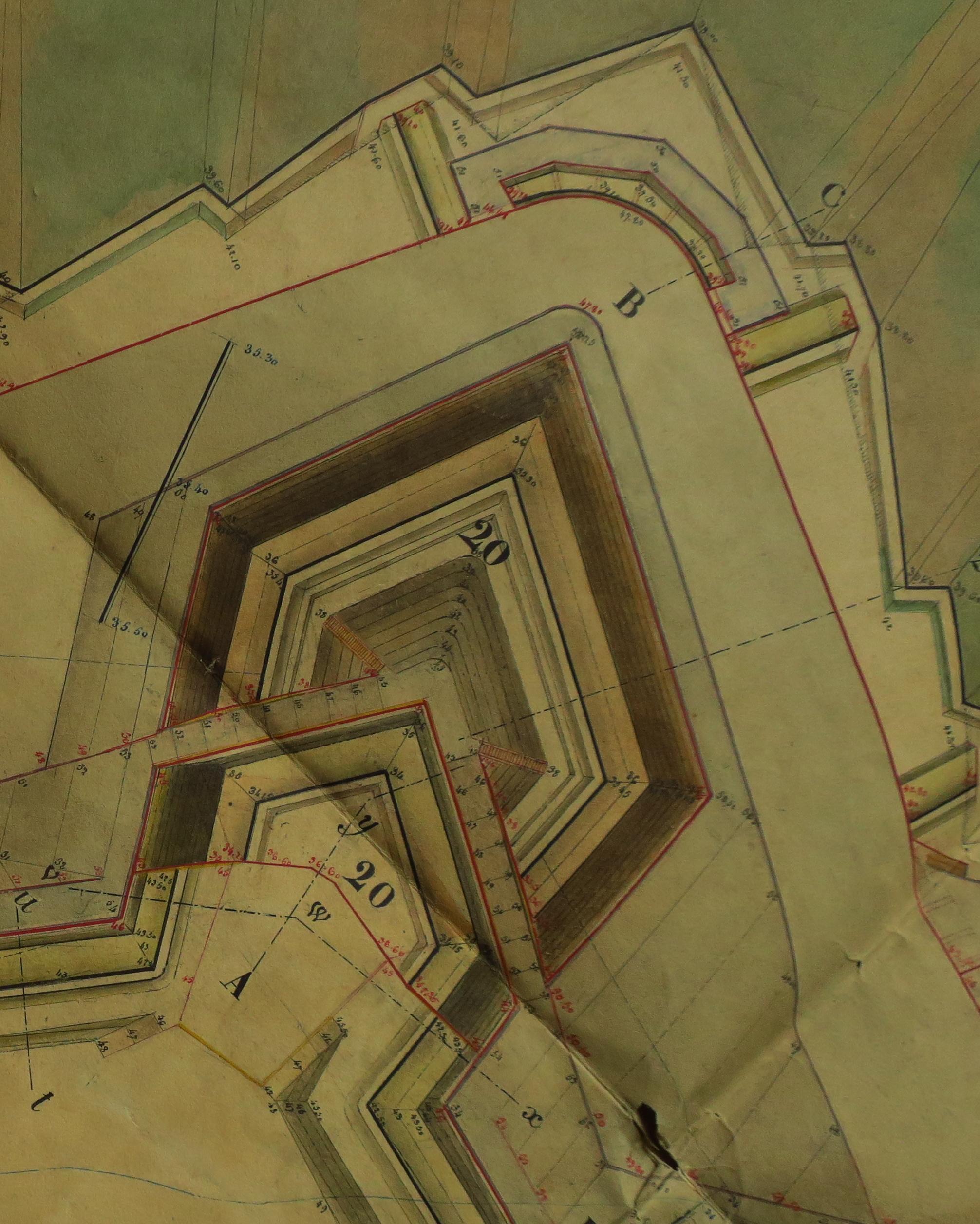 Service historique de la Défense, département Armée de Terre, Vincennes. Archives du Génie ; Article 8, Places françaises et d'Algérie : 1 VH 290, Place de Belle-Île-en-Mer, projets et dépenses annuels, 1837-1842. Direction du Génie de Nantes, Place de Belle-Ile, feuille n° 2 des projets pour 1838, enceinte de la place de Palais, 11 mars 1838.