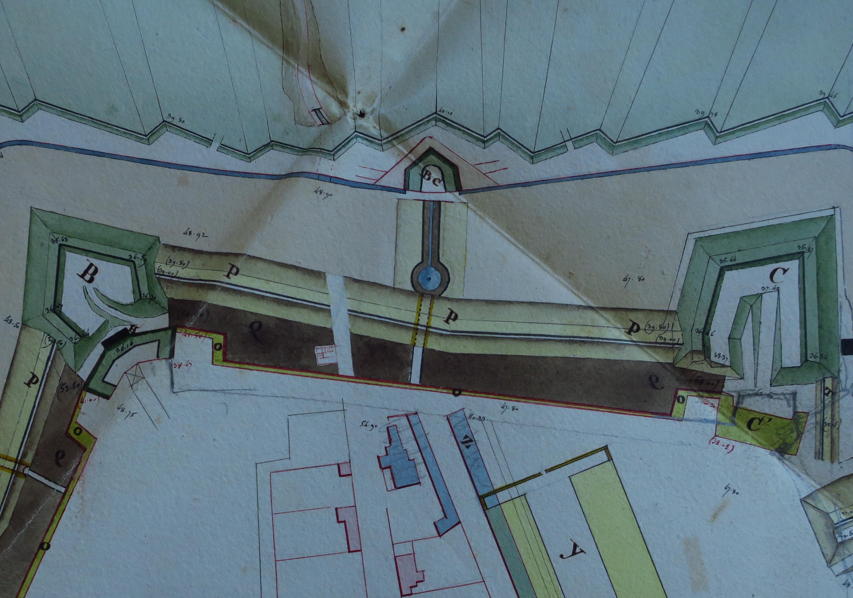 Service historique de la Défense, département Armée de Terre, Vincennes. Archives du Génie ; Article 8, Places françaises et d'Algérie : 1 VH 289, Place de Belle-Île-en-Mer, projets et dépenses annuels, 1831-1836. Direction du Génie de Nantes, Place de Belle-isle-en-Mer, feuille n° 1 des projets pour 1831, projet d'ensemble pour la place de Palais, 1er mars 1831.