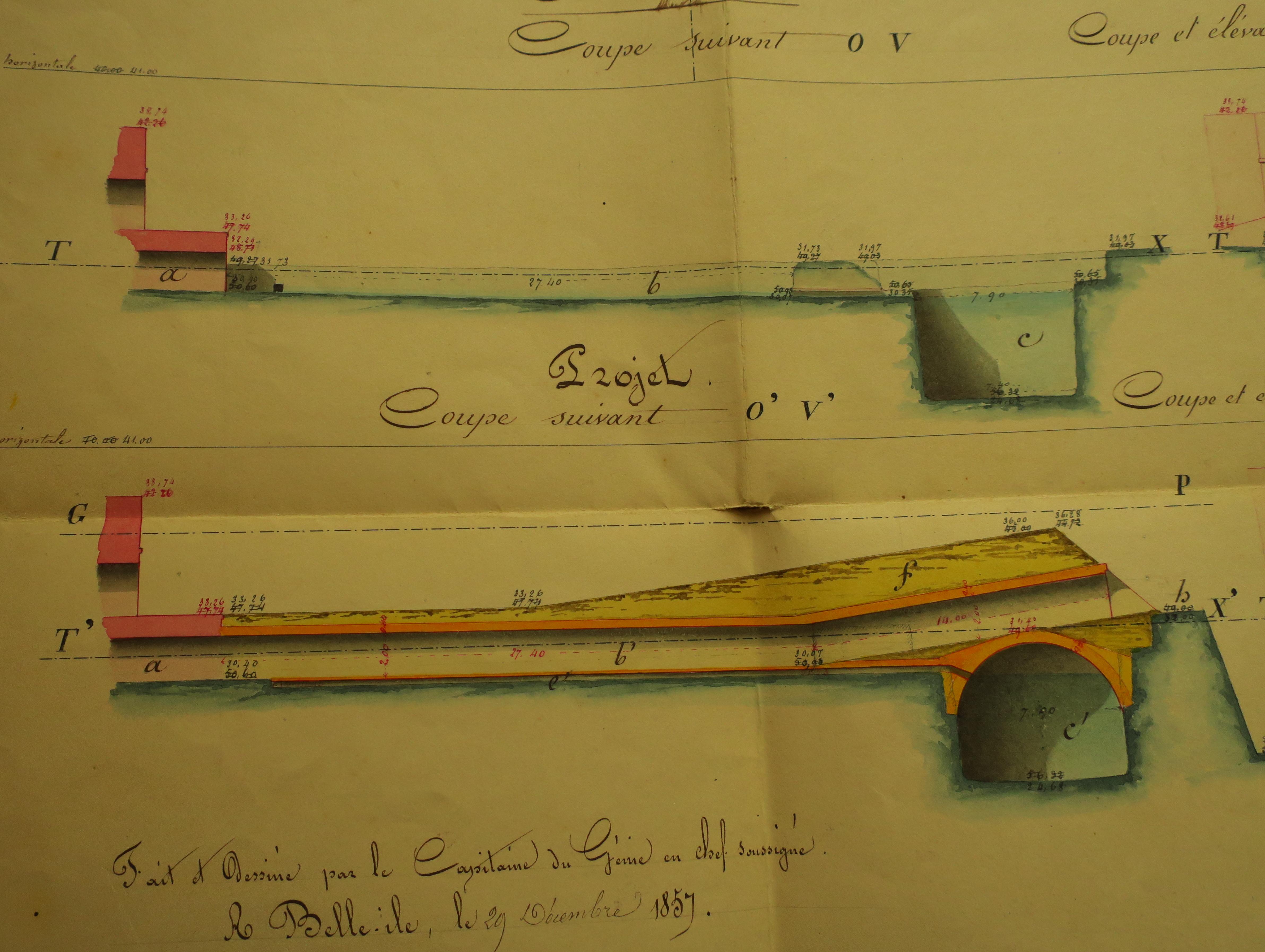Service historique de la Défense, département Armée de Terre, Vincennes. Archives du Génie ; Article 8, Places françaises et d'Algérie : 1 VH 295, Place de Belle-Île-en-Mer, projets et dépenses annuels, 1858-1859. Direction du Génie de Brest, Place de Belle-Ile, feuille n° 3 des projets pour 1858-1859, courtines 20-21 et 21-22, 29 décembre 1857.
