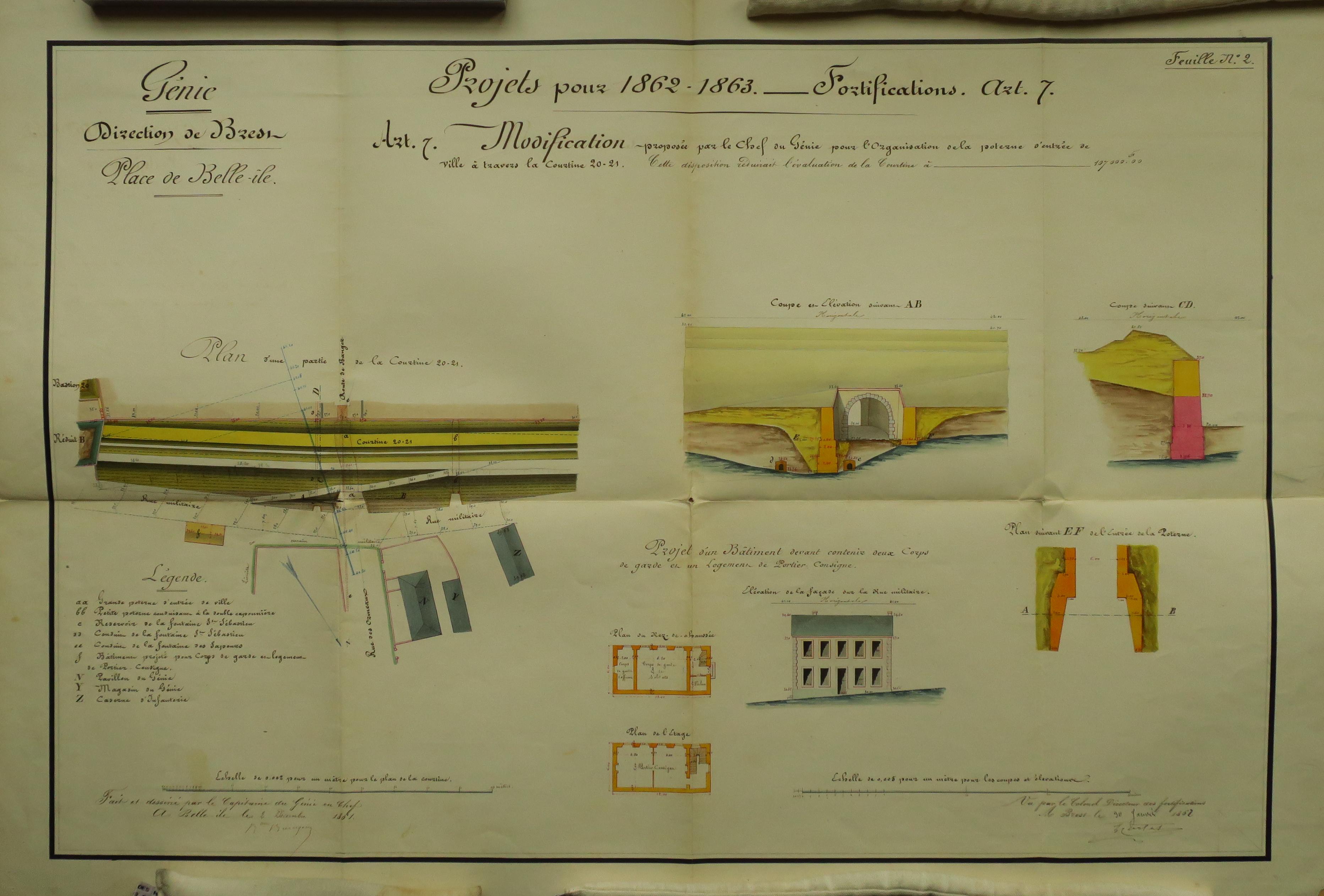 Service historique de la Défense, département Armée de Terre, Vincennes. Archives du Génie ; Article 8, Places françaises et d'Algérie : 1 VH 297, Place de Belle-Île-en-Mer, projets et dépenses annuels, 1862-1875. Direction du Génie de Brest, Place de Belle-Ile, feuille n° 2 des projets pour 1862-1863, modification proposée par le chef du génie pour l'organisation de la poterne d'entrée de ville à travers la courtine 20-21