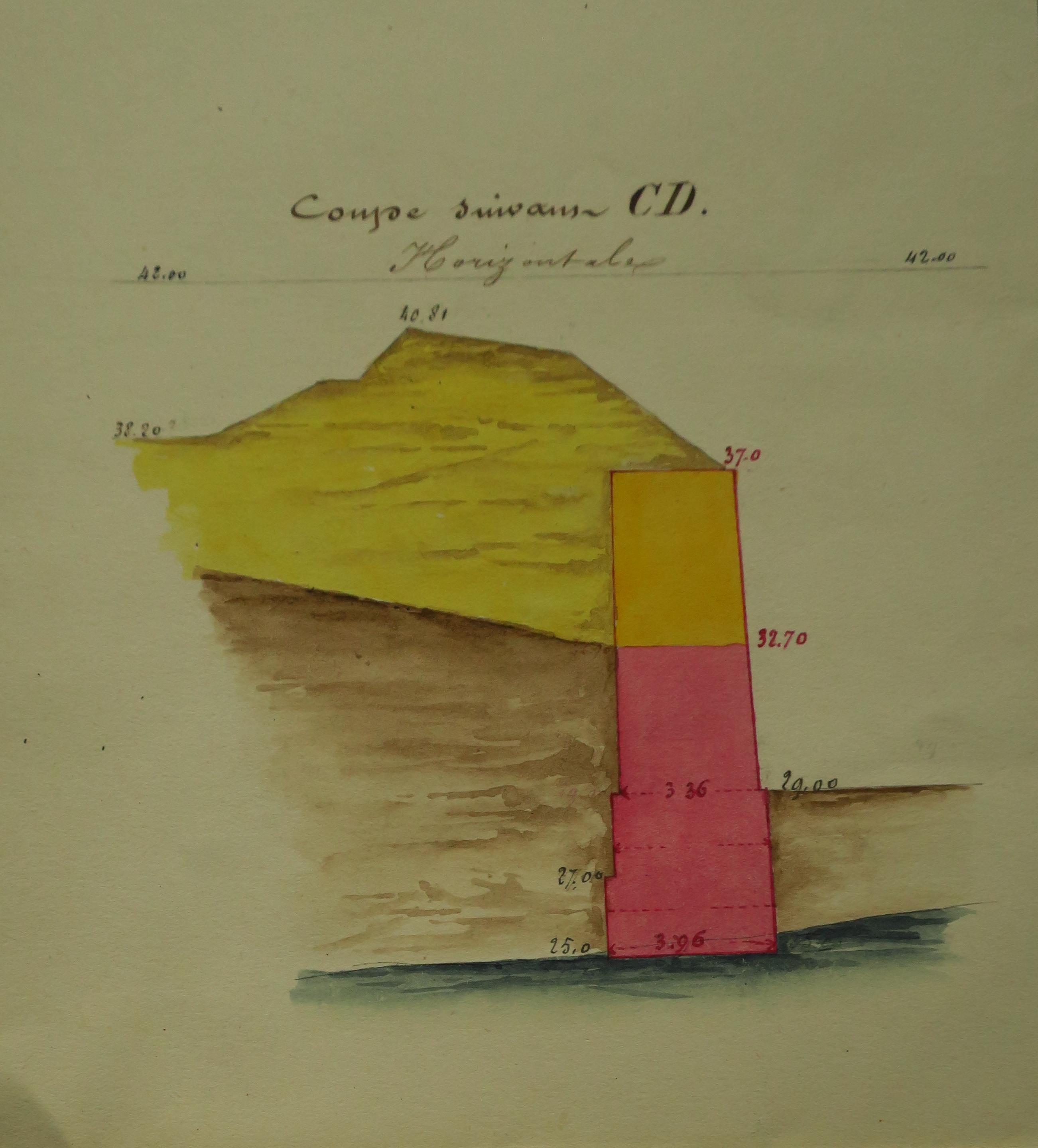Service historique de la Défense, département Armée de Terre, Vincennes. Archives du Génie ; Article 8, Places françaises et d'Algérie : 1 VH 297, Place de Belle-Île-en-Mer, projets et dépenses annuels, 1862-1875. Direction du Génie de Brest, Place de Belle-Ile, feuille n° 2 des projets pour 1862-1863, modification proposée par le chef du génie pour l'organisation de la poterne d'entrée de ville à travers la courtine 20-21
