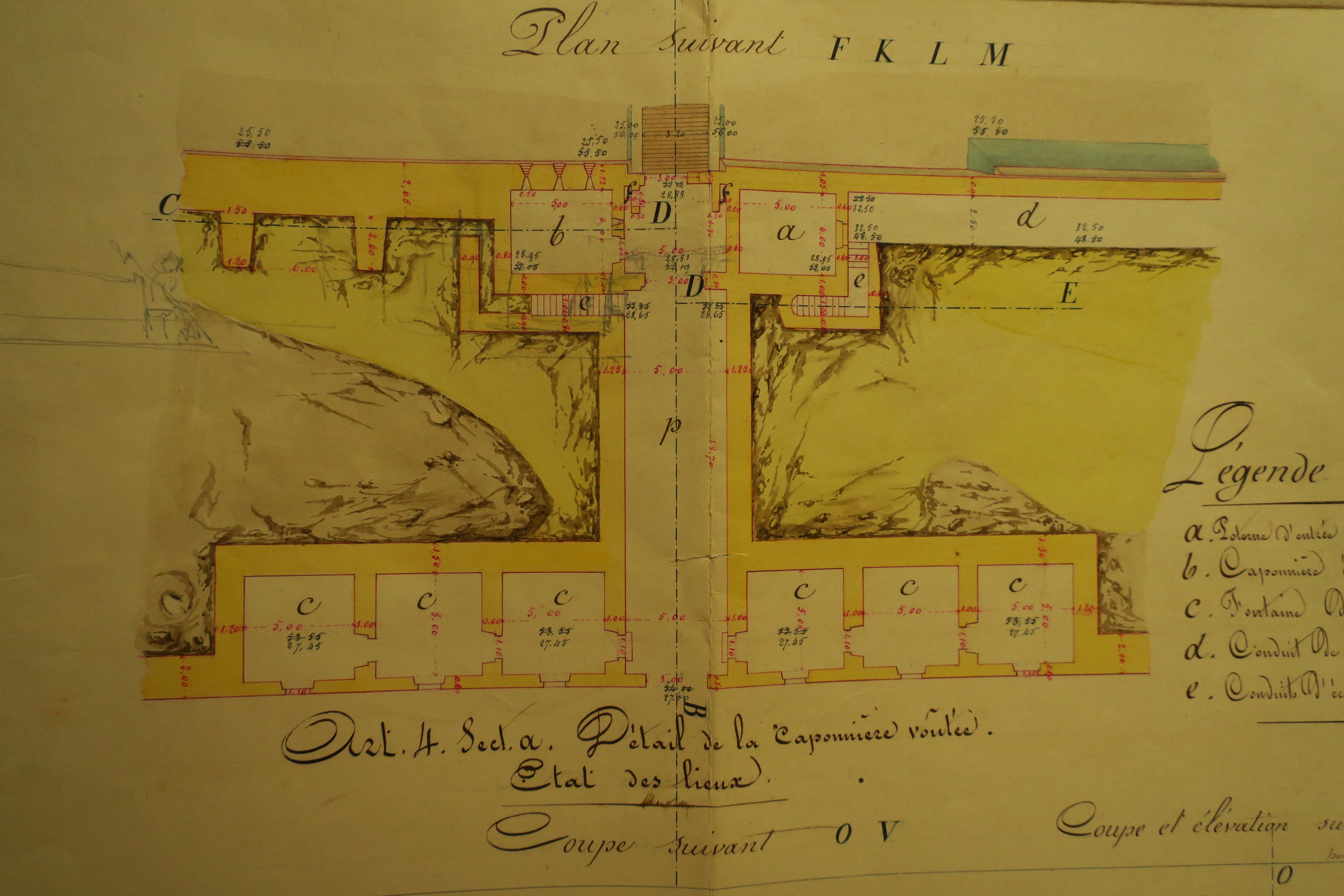Service historique de la Défense, département Armée de Terre, Vincennes. Archives du Génie ; Article 8, Places françaises et d'Algérie : 1 VH 295, Place de Belle-Île-en-Mer, projets et dépenses annuels, 1858-1859. Direction du Génie de Brest, Place de Belle-Ile, feuille n° 3 des projets pour 1858-1859, courtines 20-21 et 21-22, 29 décembre 1857.