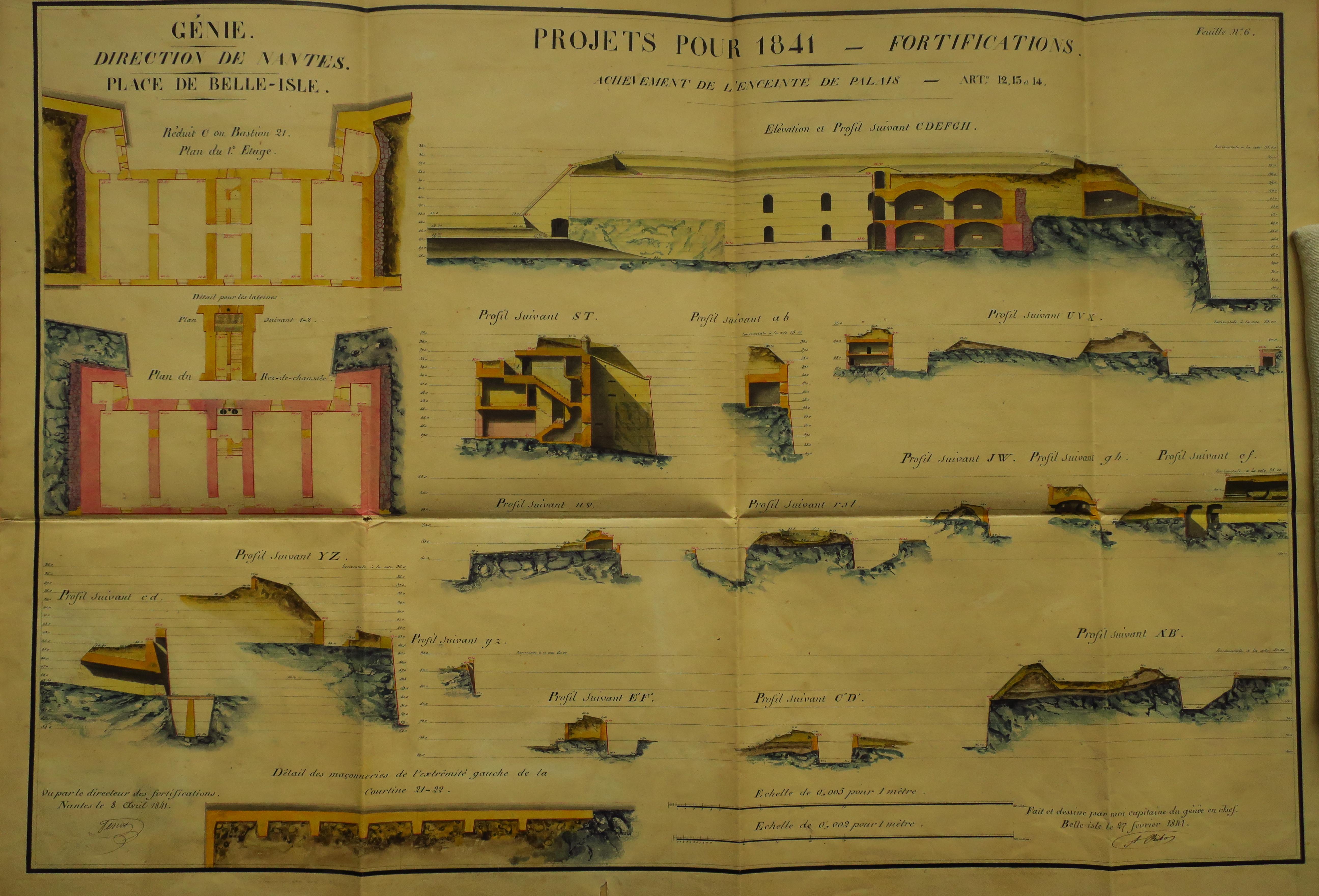 Service historique de la Défense, département Armée de Terre, Vincennes. Archives du Génie ; Article 8, Places françaises et d'Algérie : 1 VH 290, Place de Belle-Île-en-Mer, projets et dépenses annuels, 1837-1842. Direction du Génie de Nantes, Place de Belle-Ile, feuille n° 6 des projets pour 1841, achèvement de l'enceinte de Palais, 27 février 1841.
