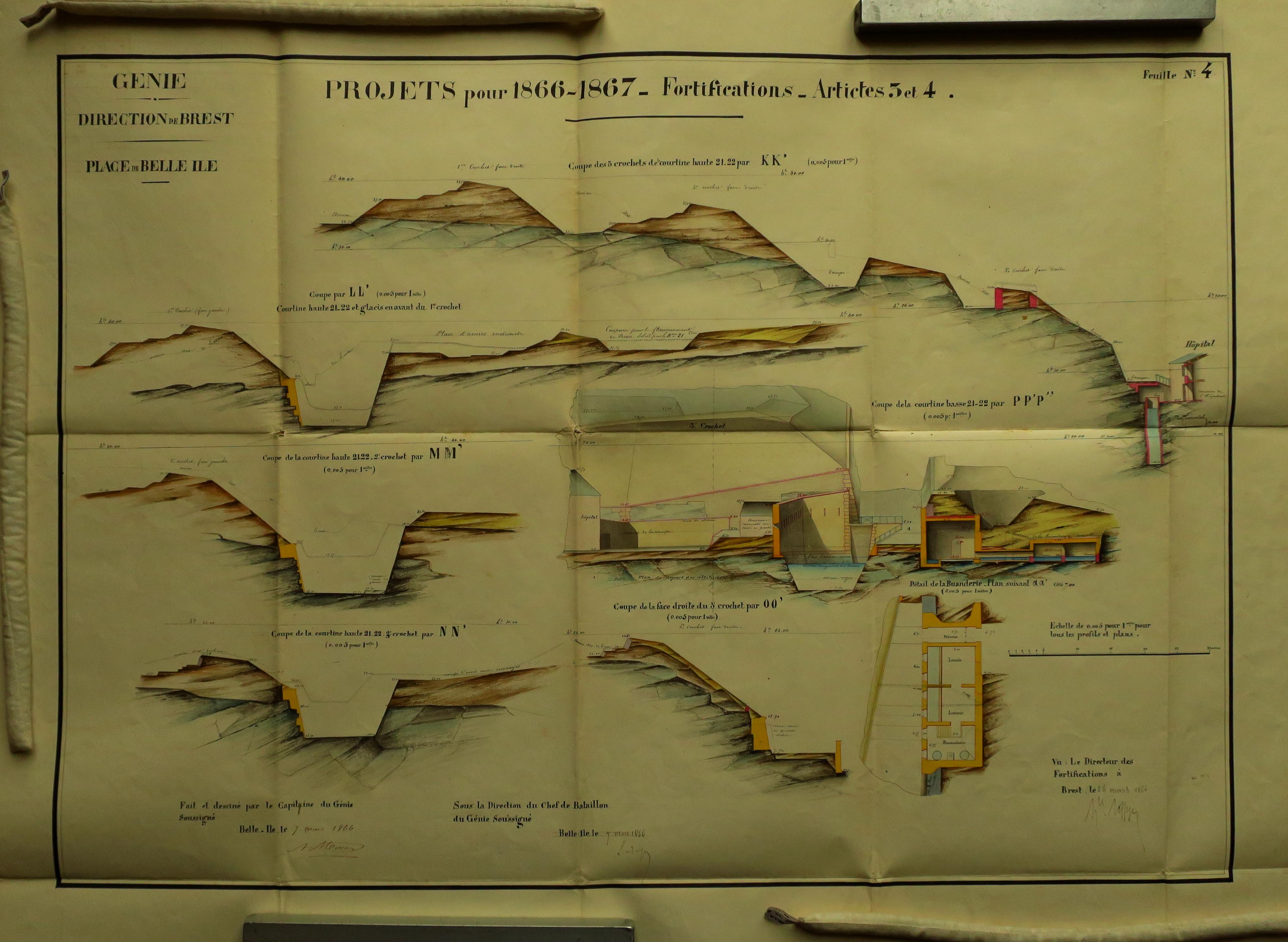 Service historique de la Défense, département Armée de Terre, Vincennes. Archives du Génie ; Article 8, Places françaises et d'Algérie : 1 VH 297, Place de Belle-Île-en-Mer, projets et dépenses annuels, 1862-1875. Direction du Génie de Brest, Place de Belle-Ile, feuille n° 4 des projets pour 1866-1867, courtine 21-22, 7 mars 1866.