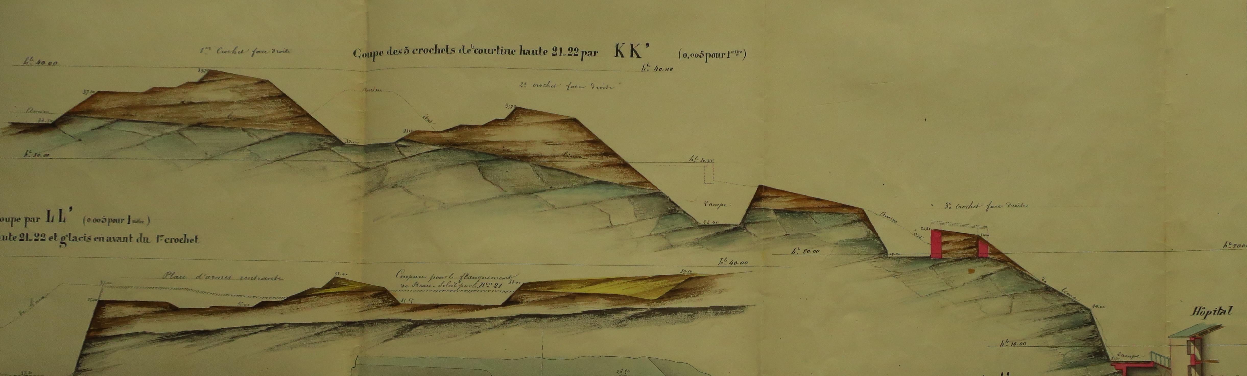 Service historique de la Défense, département Armée de Terre, Vincennes. Archives du Génie ; Article 8, Places françaises et d'Algérie : 1 VH 297, Place de Belle-Île-en-Mer, projets et dépenses annuels, 1862-1875. Direction du Génie de Brest, Place de Belle-Ile, feuille n° 4 des projets pour 1866-1867, courtine 21-22, 7 mars 1866.