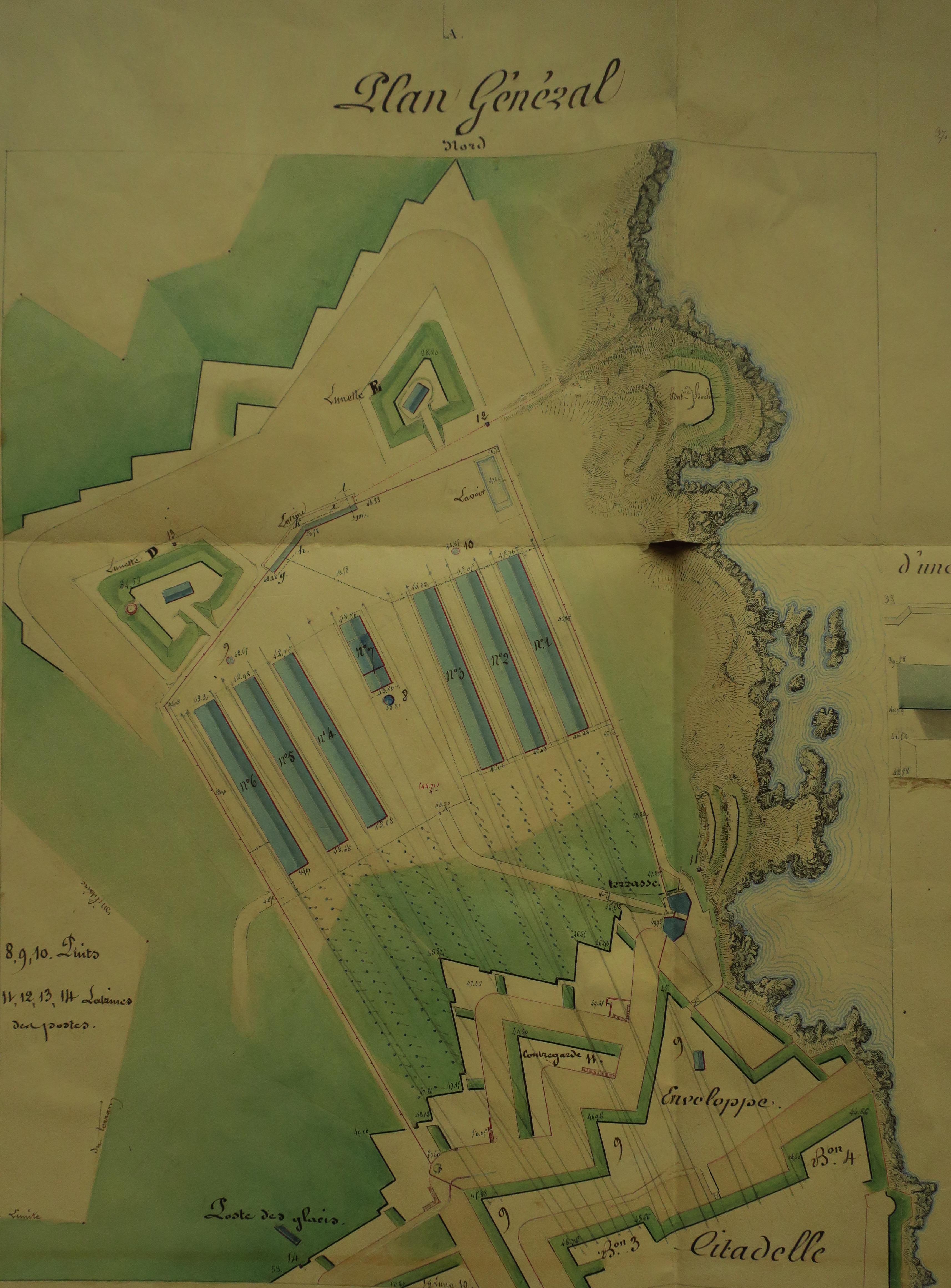 Service historique de la Défense, département Armée de Terre, Vincennes. Archives du Génie ; Article 8, Places françaises et d'Algérie : 1 VH 293, Place de Belle-Île-en-Mer, projets et dépenses annuels, 1848-1853. Direction du Génie de Brest, Place de Belle-Ile, feuille n° 5 des projets pour 1850-1851, camp de la Haute Boulogne, état des lieux, 13 février 1850.