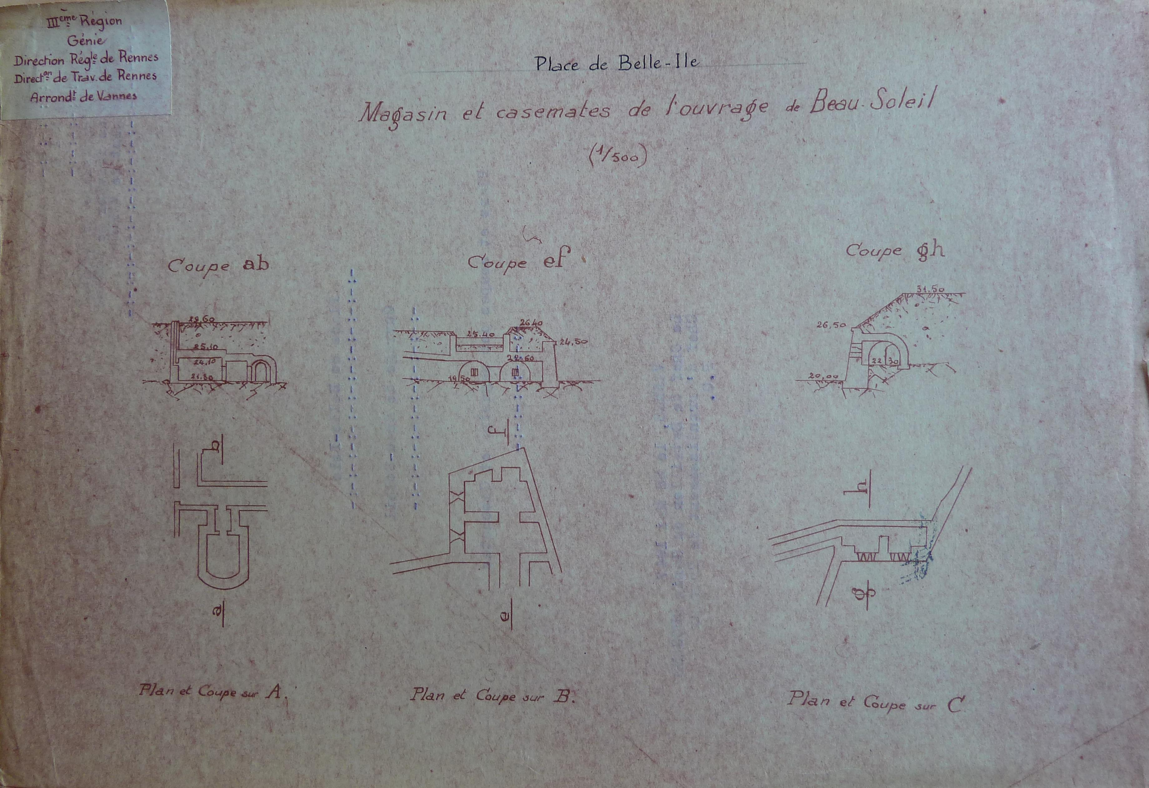 Service historique de la Défense, département Armée de Terre, Vincennes. Archives du Génie ; sous-série 3V, inspection du génie : 3 V 769, Commission de déclassement et d'aliénation d'ouvrages anciens, 1946-1947. Belle-Île, plans et coupes du magasin et casemates de l'ouvrage de Beau-Soleil.