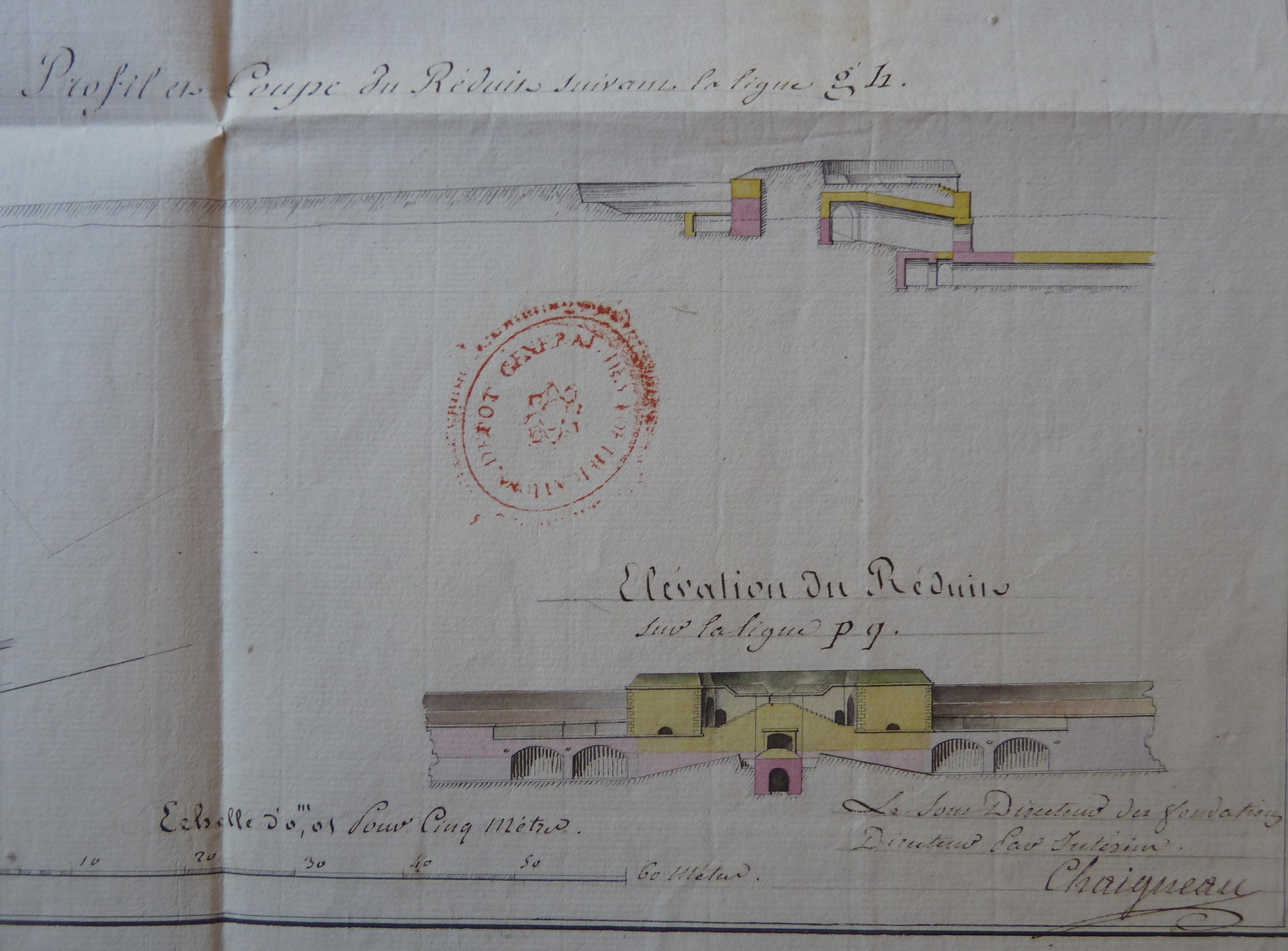Service historique de la Défense, département Armée de Terre, Vincennes. Archives du Génie ; Article 8, Places françaises et d'Algérie : 1 VH 286, Place de Belle-Île-en-Mer, projets et dépenses annuels, 1807-1816. Direction du Génie de Port-Liberté, Place de Belle-Isle, plans, coupes et élévations du réduit en construction de la place d'armes rentrante du front AB indicatif de sa situation au 15 novembre 1809.