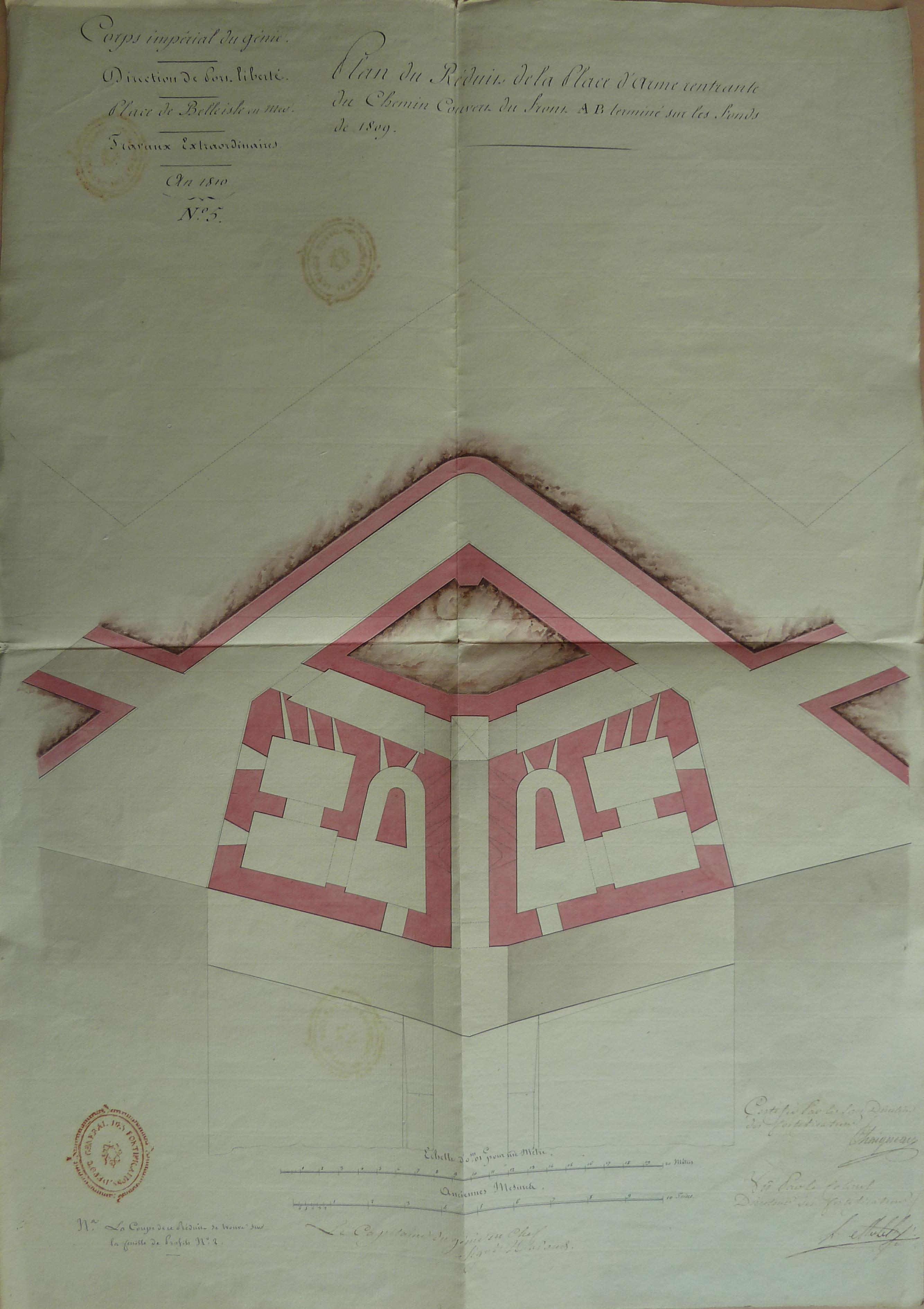 Service historique de la Défense, département Armée de Terre, Vincennes. Archives du Génie ; Article 8, Places françaises et d'Algérie : 1 VH 286, Place de Belle-Île-en-Mer, projets et dépenses annuels, 1807-1816. Direction du Génie de Port-Liberté, Place de Belle-Isle, plan du réduit de la place d'armes rentrante du chemin couvert du front AB terminé sur les fonds de 1809, 1810.
