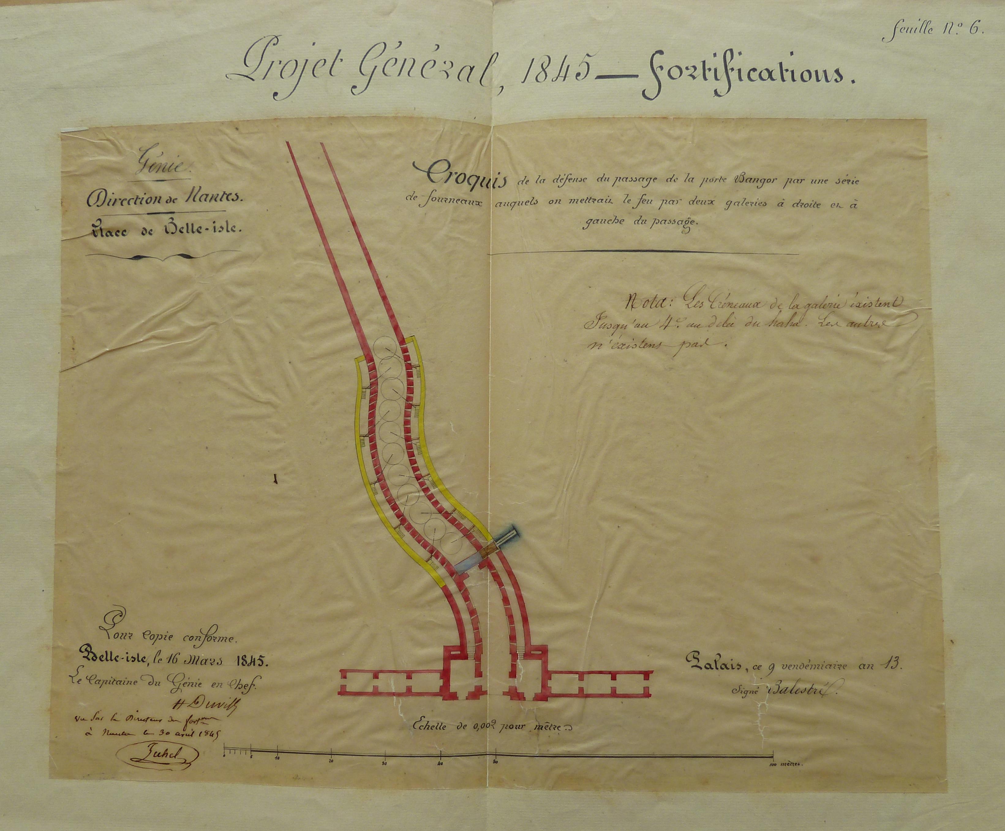 Service historique de la Défense, département Armée de Terre, Vincennes. Archives du Génie ; Article 8, Places françaises et d'Algérie : 1 VH 291, Place de Belle-Île-en-Mer, projets et dépenses annuels, 1843-1846. Direction du Génie de Nantes, Place de Belle-Isle, feuille n° 6 des projets pour 1845, croquis de la défense du passage de la porte Bangor par une série de fourneaux auquels on mettrait le feu par deux galeries à droite et à gauche du passage, 16 mars 1845.