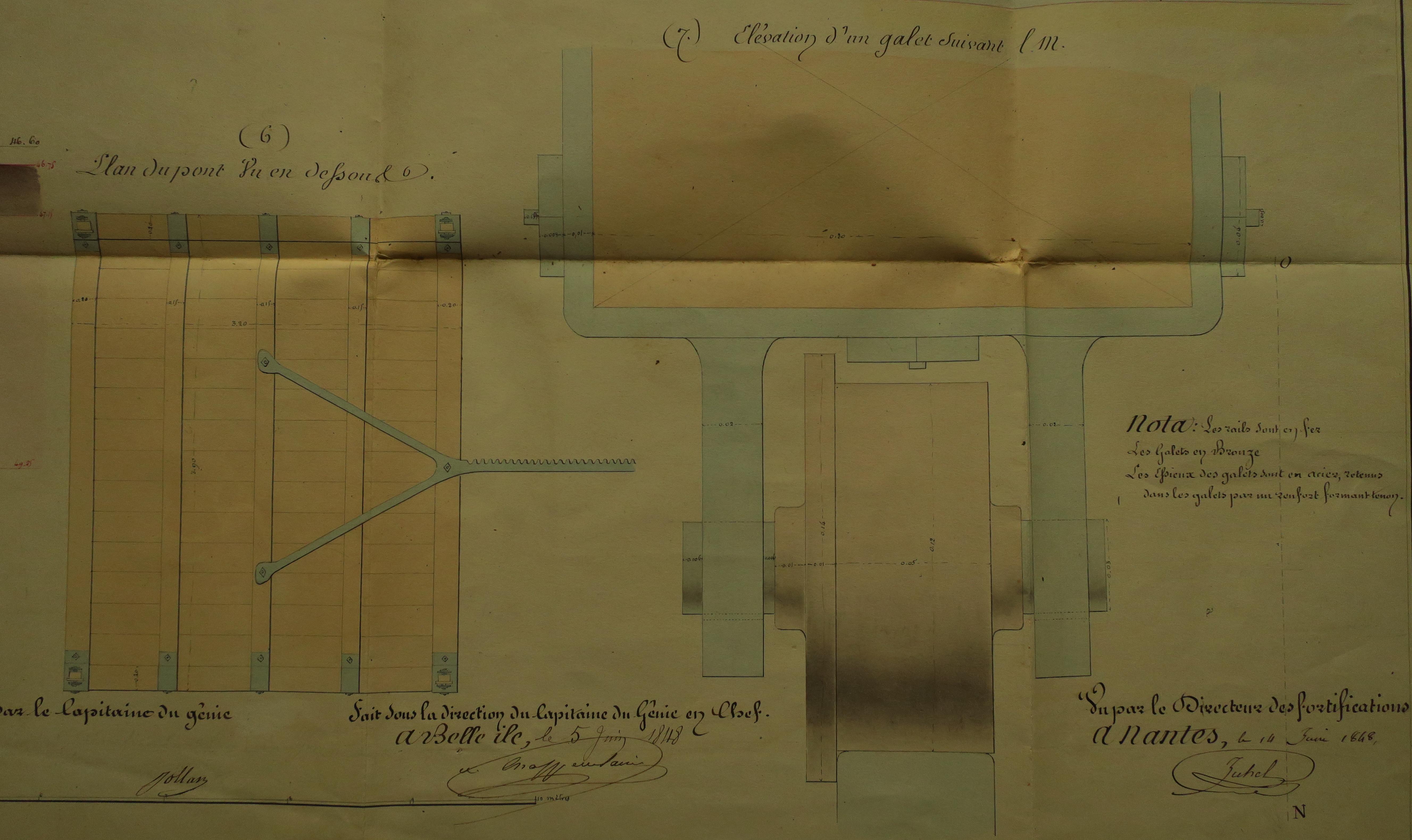 Service historique de la Défense, département Armée de Terre, Vincennes. Archives du Génie ; Article 8, Places françaises et d'Algérie : 1 VH 293, Place de Belle-Île-en-Mer, projets et dépenses annuels, 1848-1853. Direction du Génie de Nantes, Place de Belle-Ile, feuille n° 16 des projets pour 1848, porte de Bangor, refaire le pont-levis, 5 juin 1848.