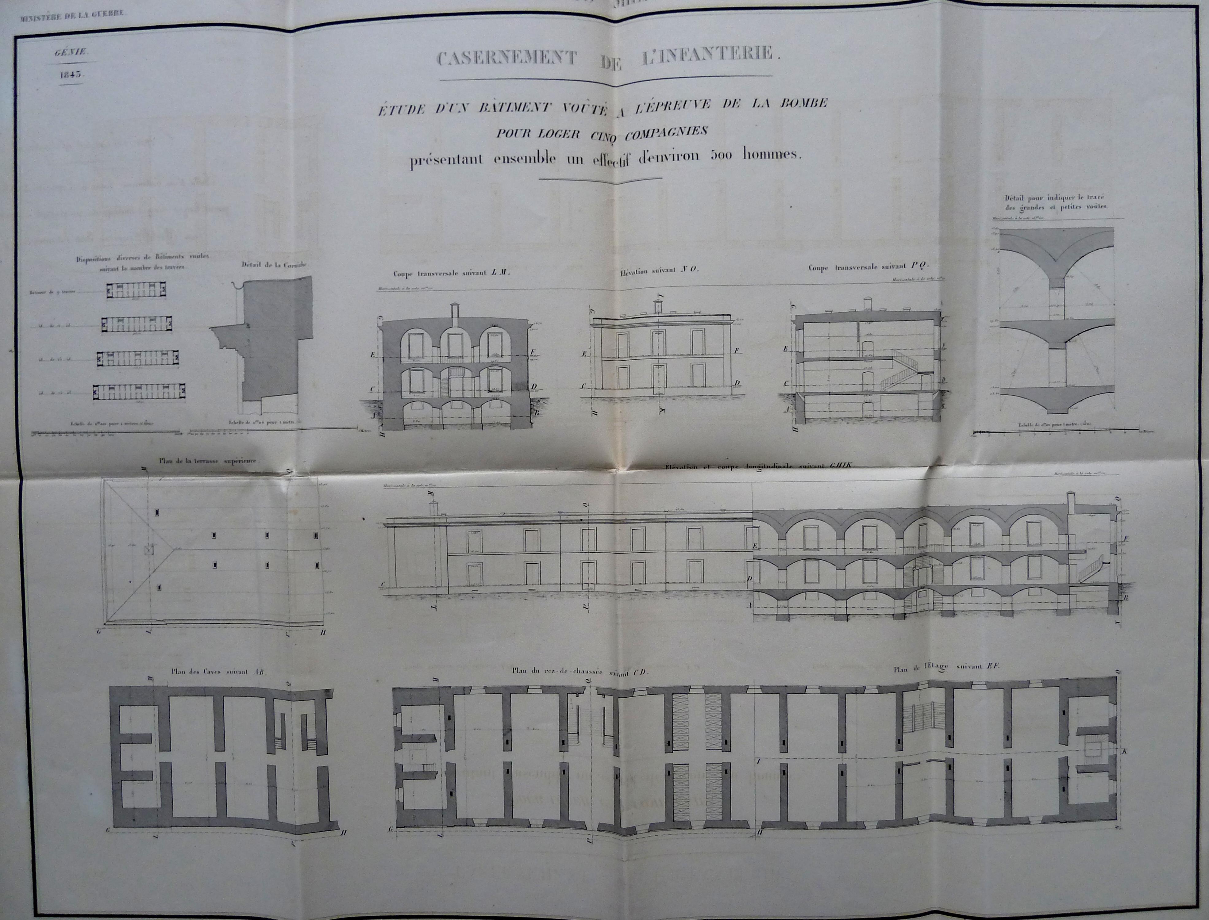 Service historique de la Défense, département Armée de Terre, Vincennes. Archives du Génie ; Article 12, Avis du Comité : 1 VK 139, Objets d'art : notes, mémoires et croquis de types (modèles) annexés aux avis du Comité du génie. Étude d'un bâtiment voûté à l'épreuve de la bombe pour loger cinq compagnies, 1843.