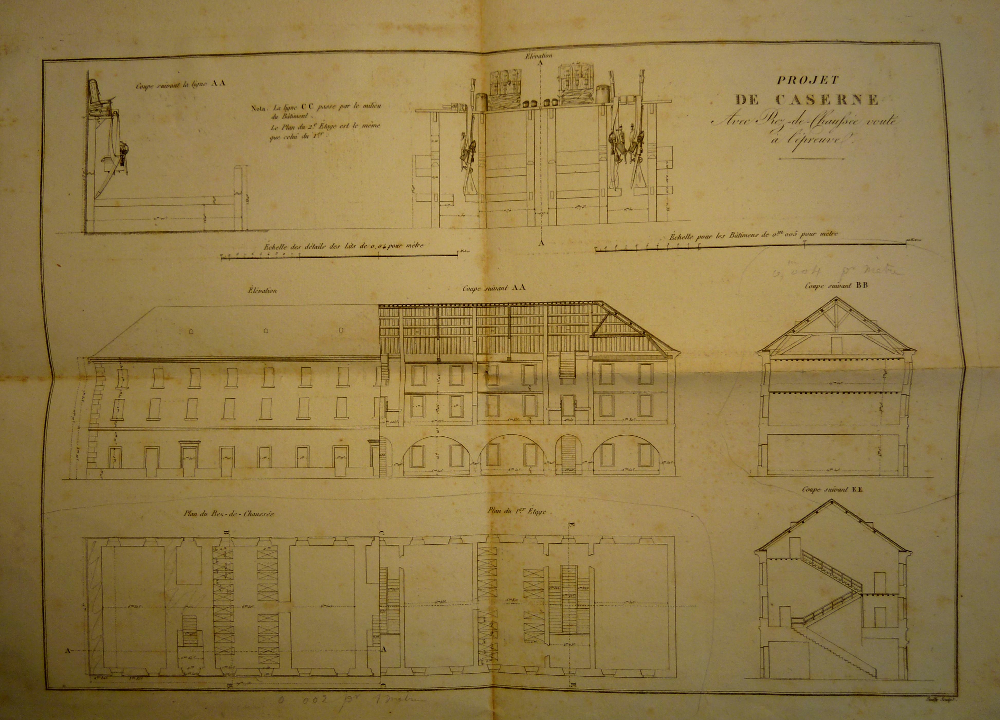 Service historique de la Défense, département Armée de Terre, Vincennes. Archives du Génie ; Article 12, Avis du Comité : 1 VK 139, Objets d'art : notes, mémoires et croquis de types (modèles) annexés aux avis du Comité du génie. Haxo, projet de caserne avec rez-de-chaussée voûté à l'épreuve, 1826.