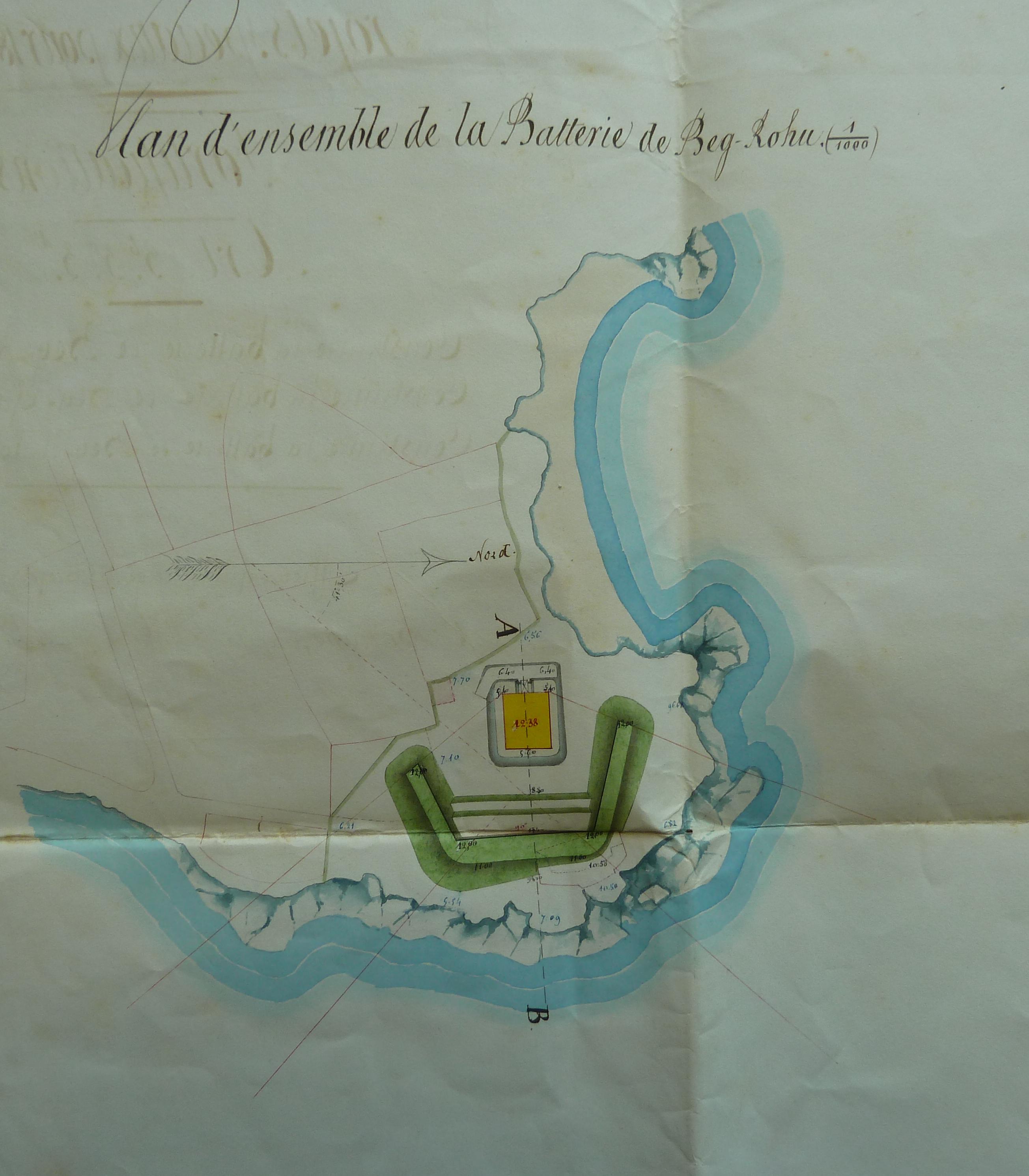 Service historique de la Défense, département Armée de Terre, Vincennes. Archives du Génie ; Article 8, Places françaises et d'Algérie : 1 VH 1518, Place de Quiberon, projets et dépenses annuels, 1847-1874. Direction du Génie de Brest, Place de Quiberon, feuille des projets pour 1859-1860, batteries de Beg Rohu, Beg Quilvi et Beg el Lan, 25 novembre 1859.