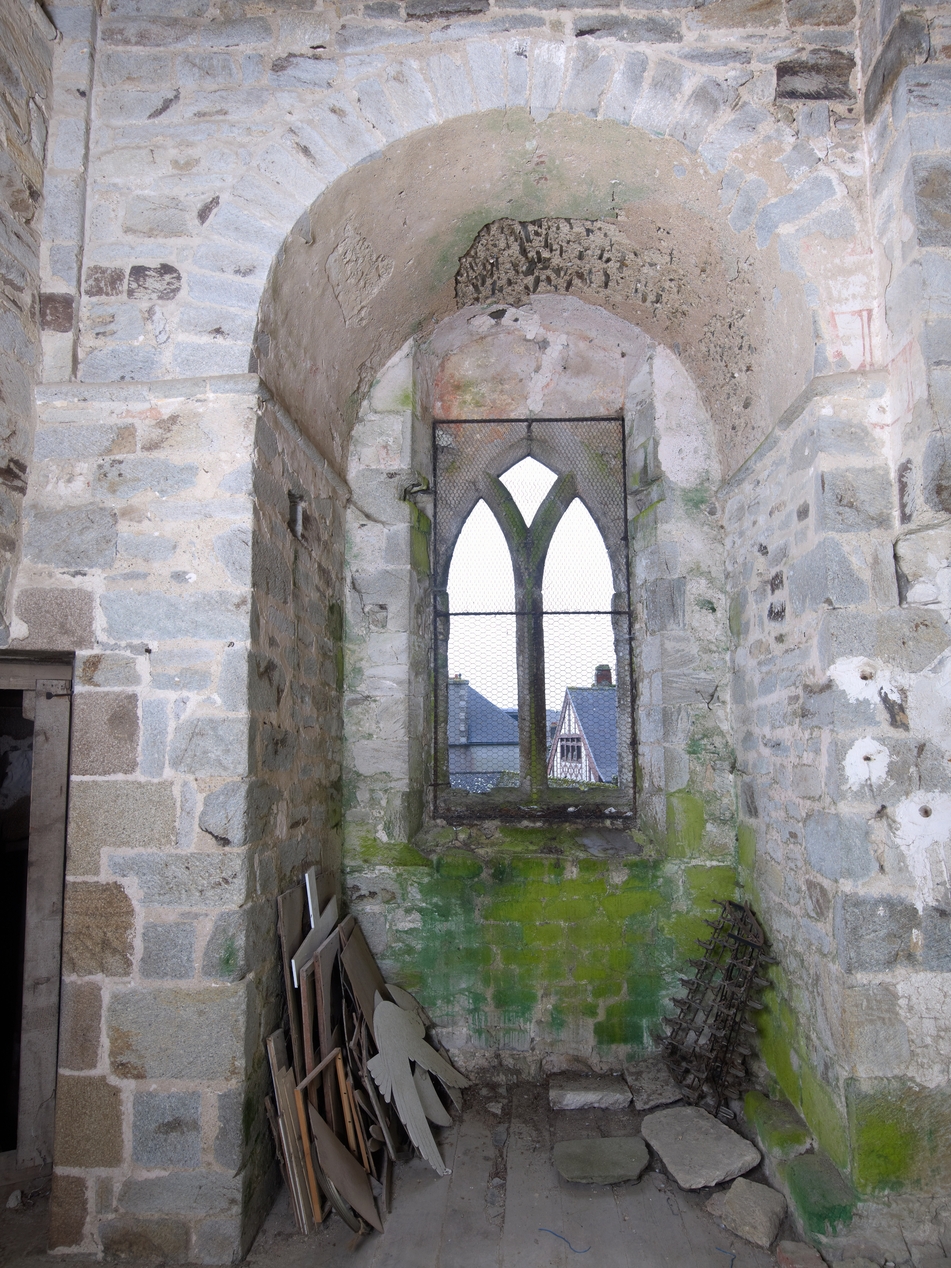 Deuxième niveau de la tour Hasting, élévation est, baie à remplage gothique en Y. A droite sur la voûte, on peut observer les vestiges d'un enduit en faux appareilImmatriculation