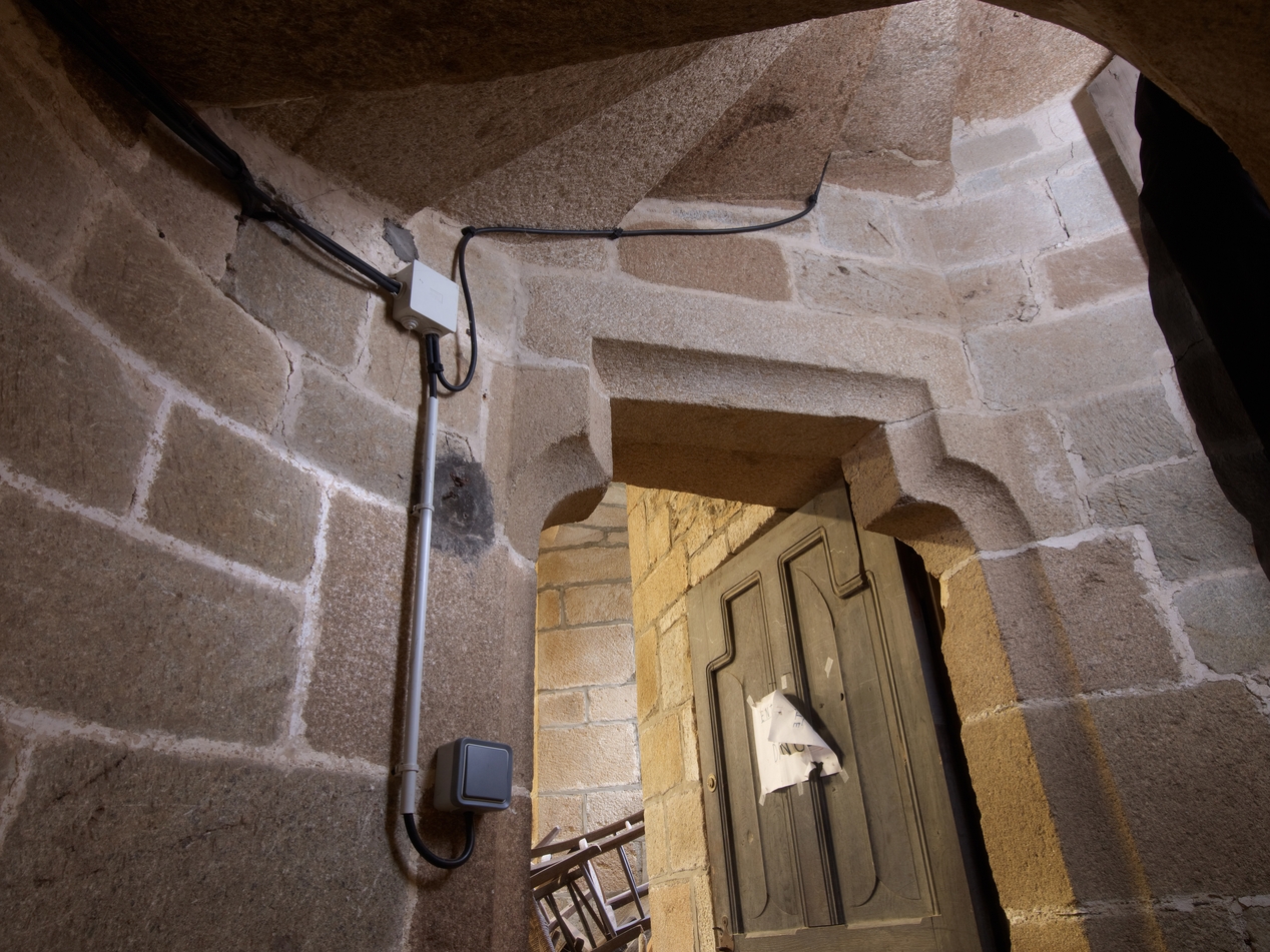 Tourelle d'escalier de la tour Hasting, porte d'accès à l'étage de la sacristie faisant bibliothèque. Il s'agit d'un linteau sur coussinet en graniteImmatriculation