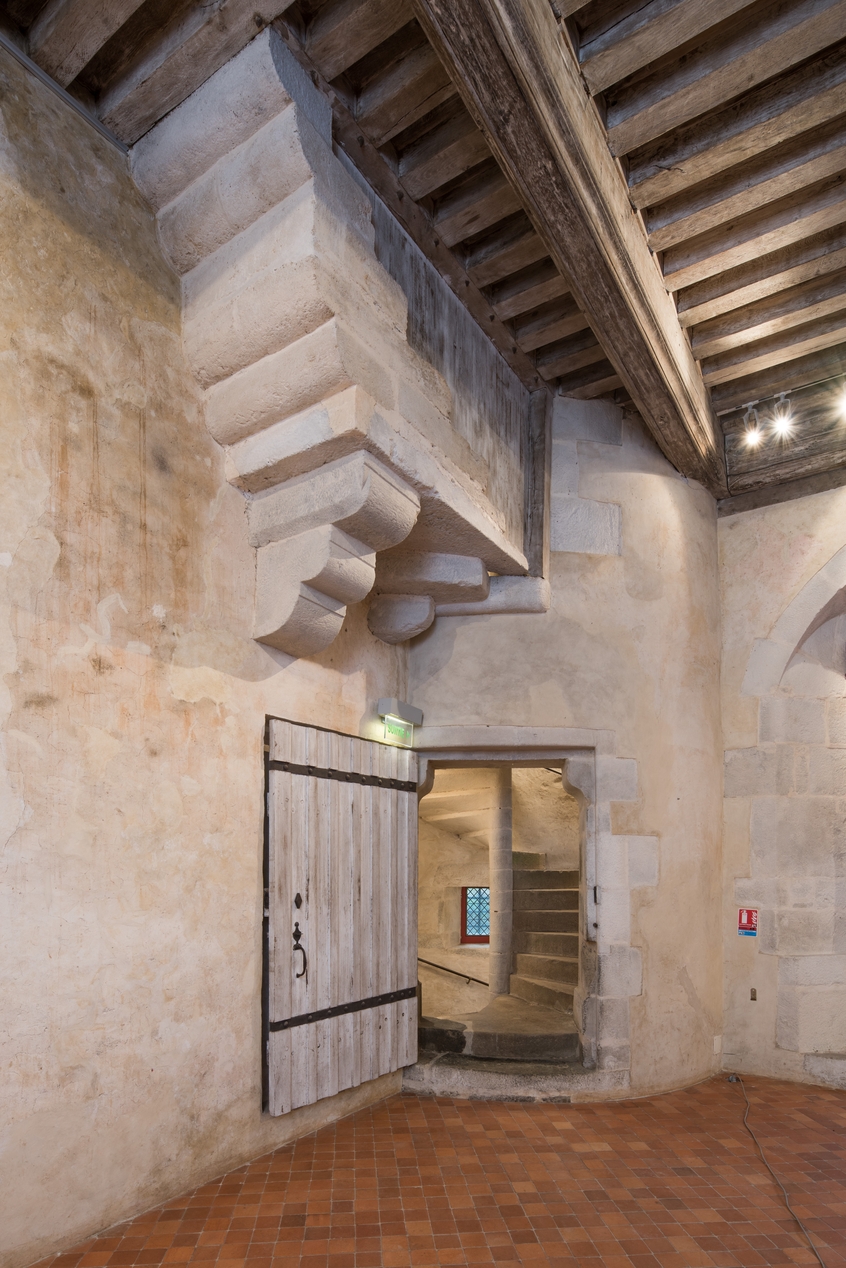 Logis seigneurial, entrée de la salle ou de la grande chambre du 1er étage (porte ouverte), surplomb du palier du 2ème étageImmatriculation