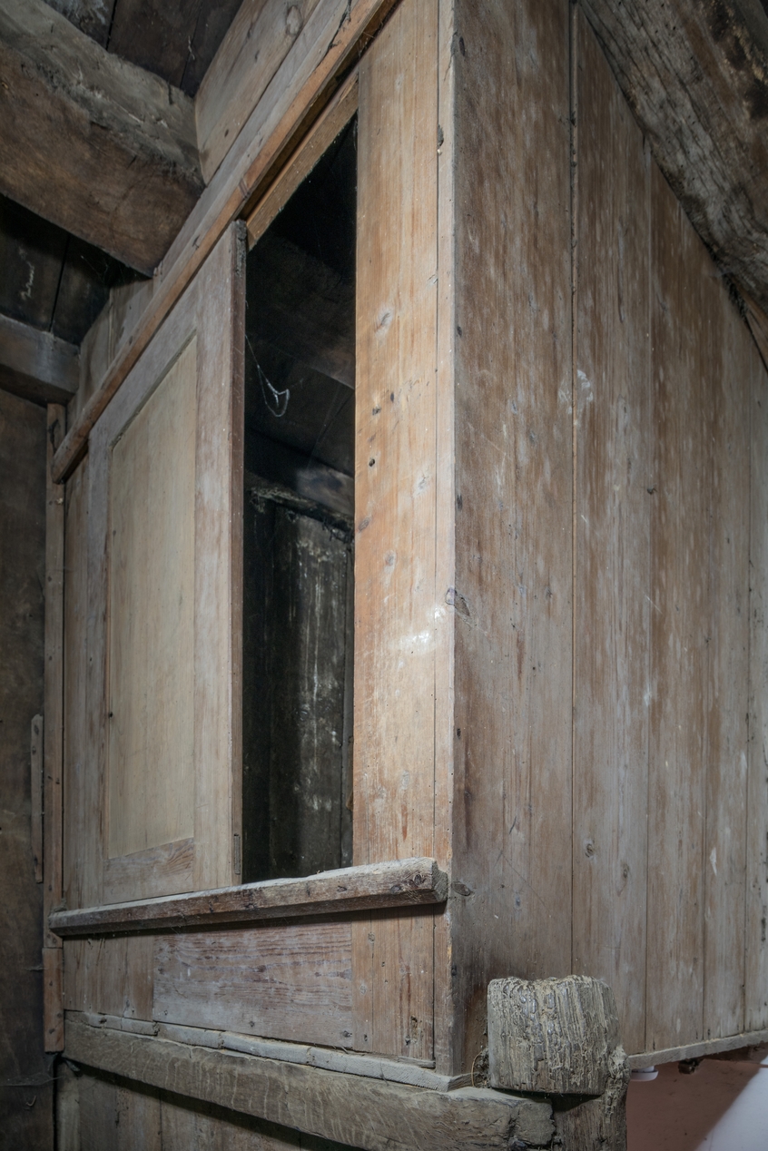 Tour d'escalier. Détail du placard à porte coulissante aménagé au sommet de l'escalierImmatriculation