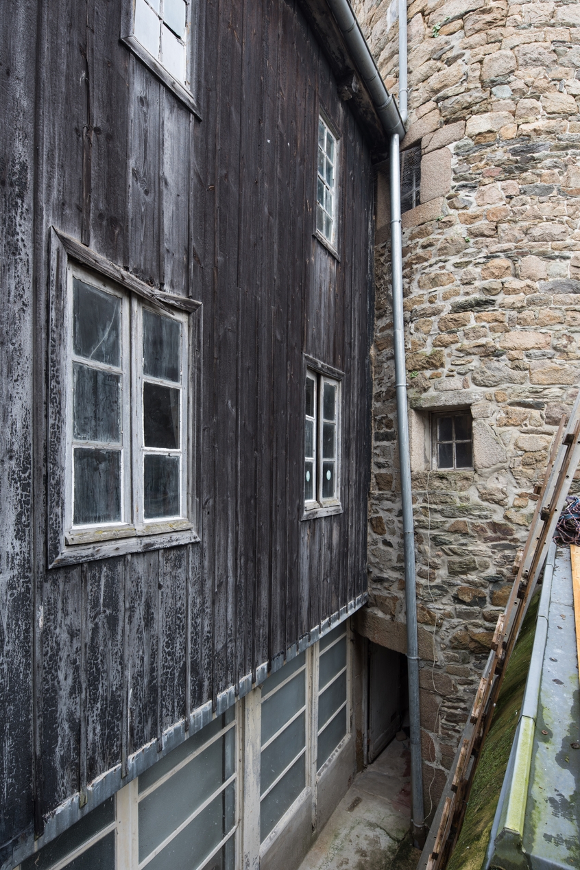Jonction entre la tour d'escalier et le logement secondaire en ossature et bardage bois construit en retour d'équerre de la maison principaleImmatriculation