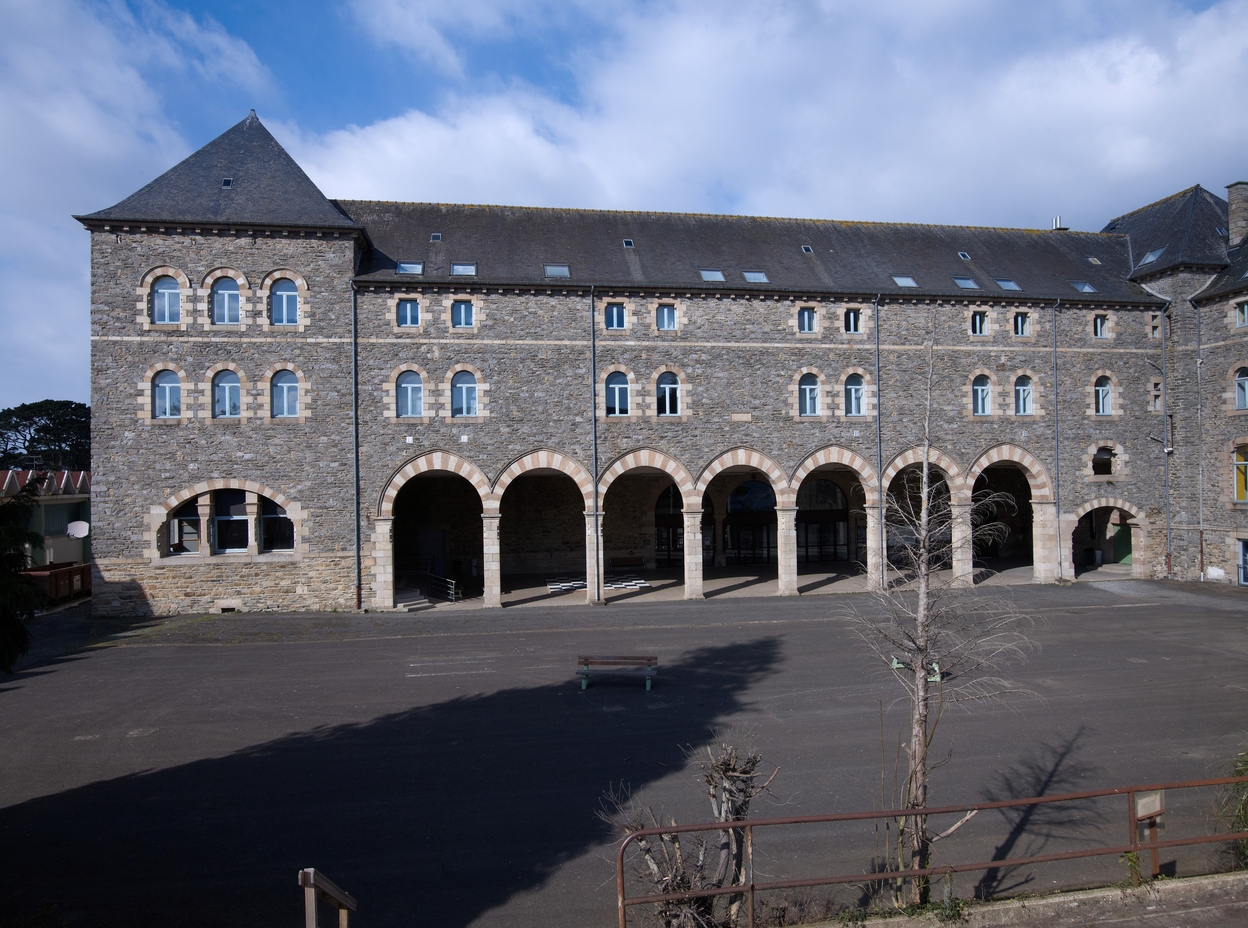 Tréguier : petit séminaire actuellement lycée Joseph Savina, cours principale environnée de bâtiments. Le bâtiment comprend au rez-de-chaussée le préau avec ses arcades, la scène et la salle des conférencesImmatriculation