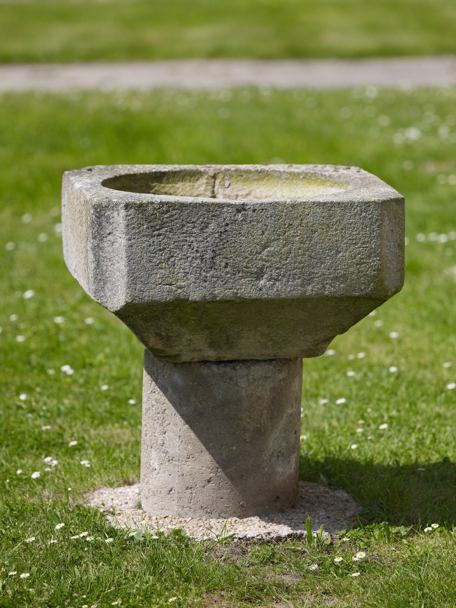 Ancienne cuve baptismale située à l'extérieur, à proximité du transept sud de l'église.Immatriculation