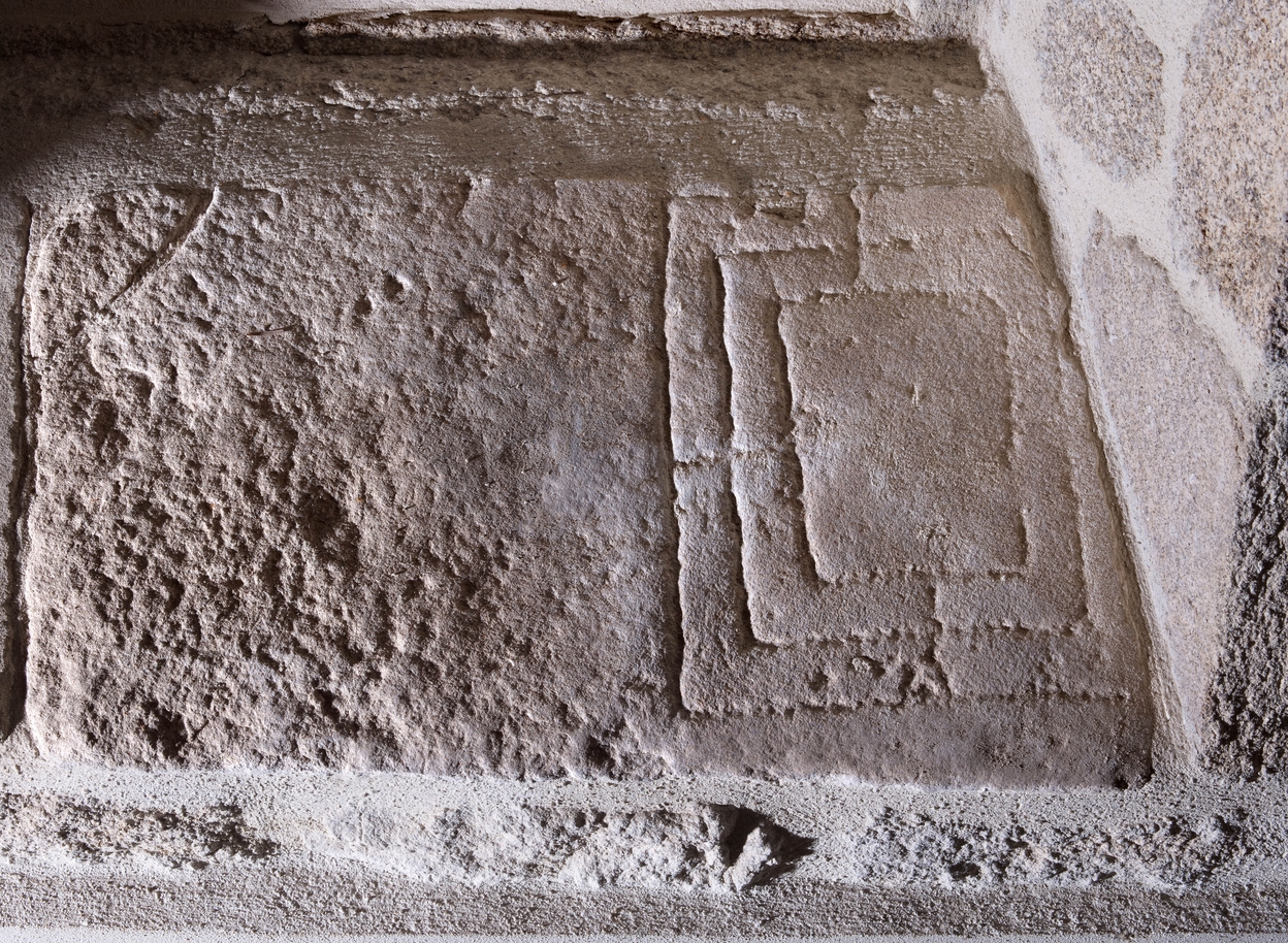 Réemplois d'une pierre médiévale représentant un jeu de marelle.Immatriculation