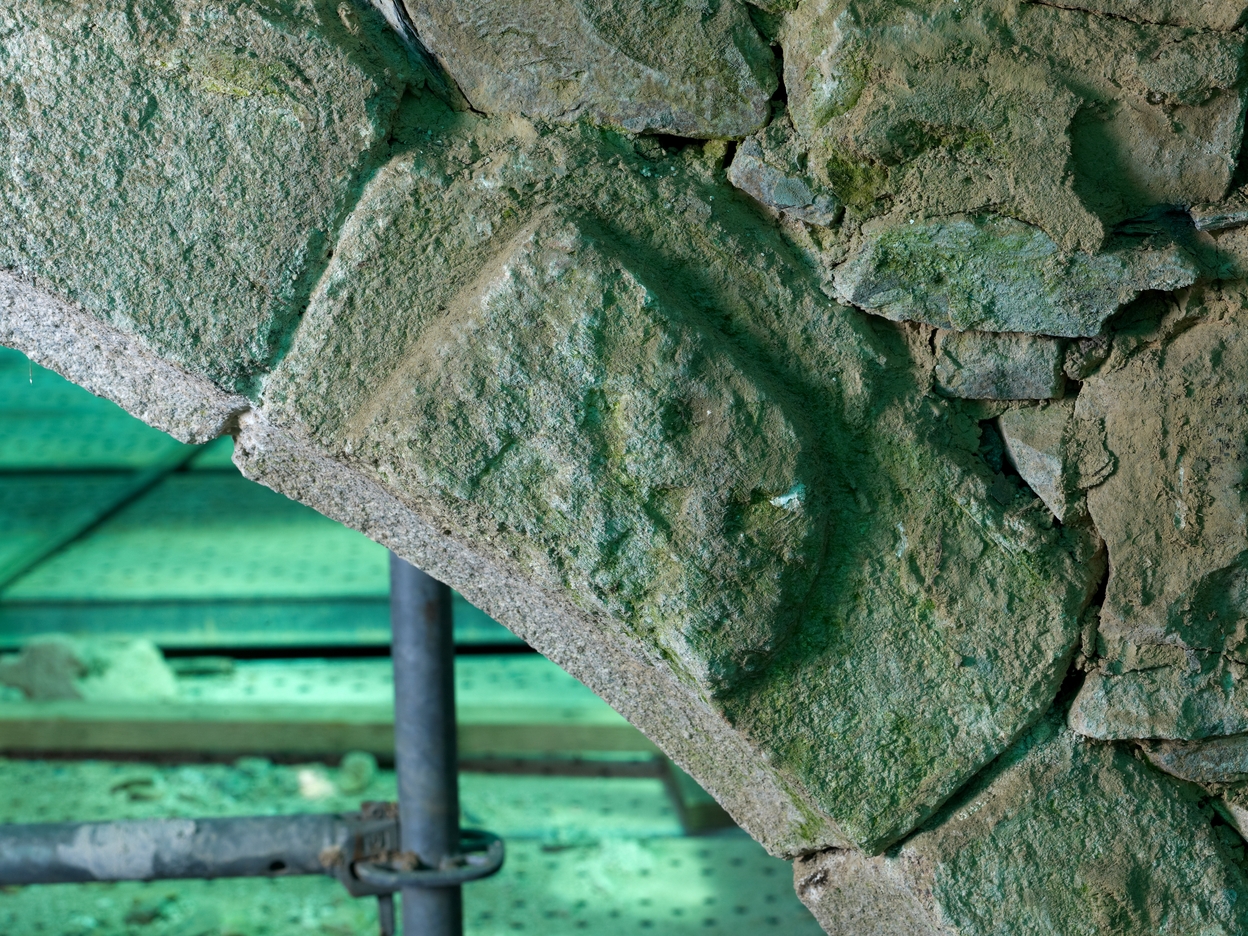 Armoiries de Coattarel Le Rouge d'Ancremel sculptées sur l'arcade de la chapelle nordImmatriculation