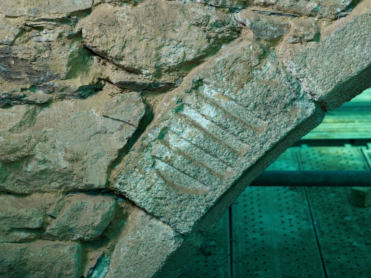 Armoiries de la famille de Coattarel sculptées sur l'arcade de la chapelle nord ("d'azur à trois fasces d'argent." - alias : "d'argent à trois fasces d'azur")Immatriculation