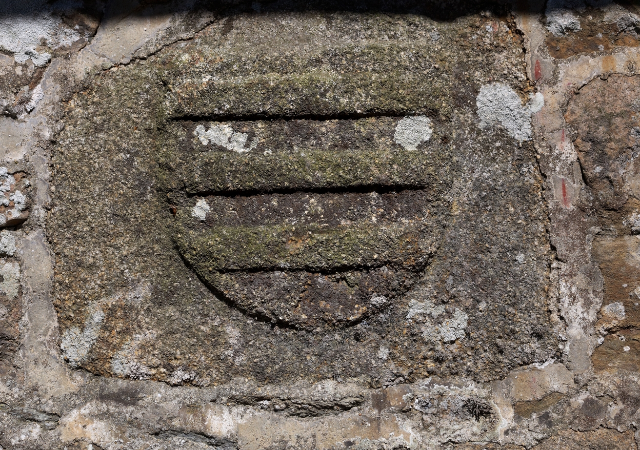 Armoiries de la famille de Coattarel sur la façade nord ("d'azur à trois fasces d'argent." - alias : "d'argent à trois fasces d'azur")Immatriculation