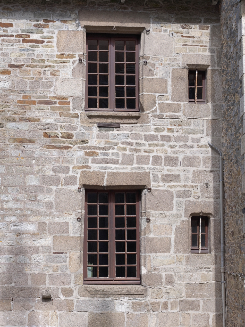 Façade ouest. Détail des anciennes fenêtres à croisée et des deux jours superposés dans l'angle sud-ouest.Immatriculation