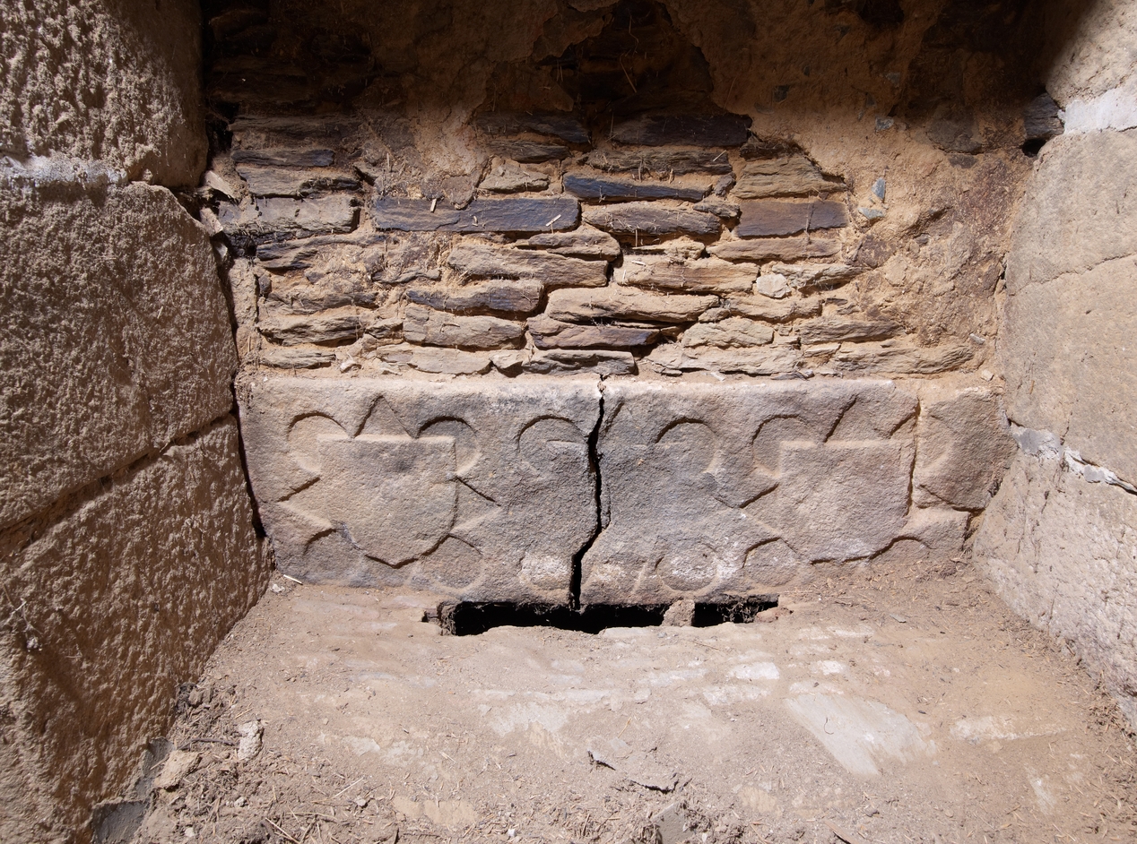 Logis secondaire construit en alignement du logis principal. Cheminée de l'étage. Détail des pierres armoriées placées dans l'âtreImmatriculation