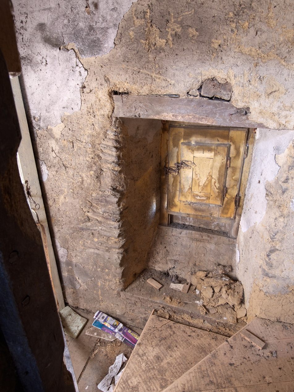 Logis principal. Cage d'escalier. Mur nord. Détail d'une petite fenêtre avec cadre d'huisserie et vantail d'origine en placeImmatriculation