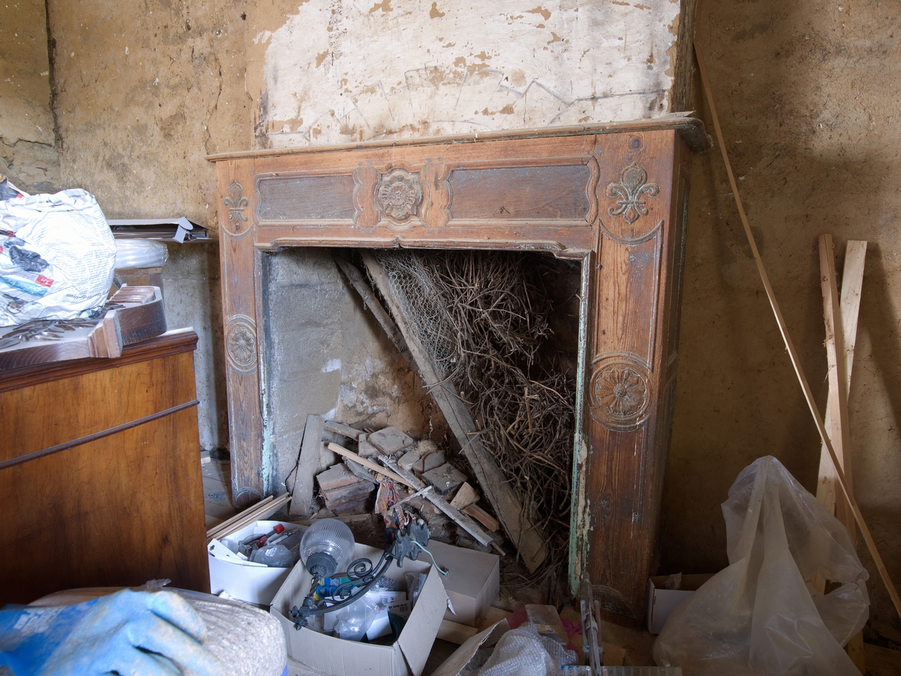 Logis principal. 1er étage. Pignon est. Cheminée boisée du 18e siècle à décor sculpté de rosaces et de fleurs de lysImmatriculation
