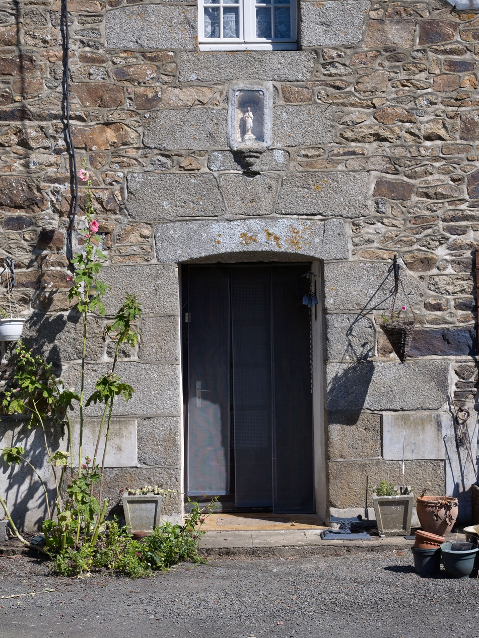 Prat, Kergoat : logis de ferme, élévation antérieure orientée vers le sud, détail de la porte avec linteau en arc segmentaire et niche à statueImmatriculation