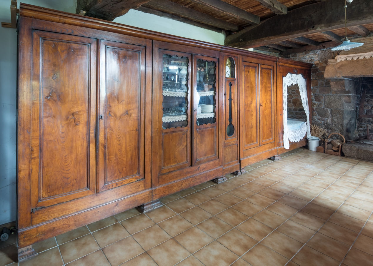 Prat, Goaz an Floc'h : salle du rez-de-chaussée, ensemble mobilier : armoire, vaisselier, armoire et lit-closImmatriculation