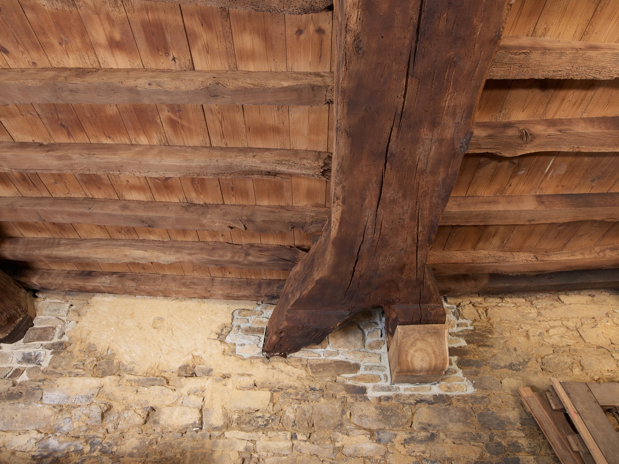 Salle du rez-de-chaussée : détail du plancher avec poutre soutenue par une consoleImmatriculation